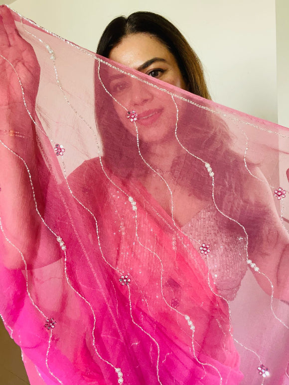 Introducing the Aaina Sequins Pearl Chiffon Saree, the epitome of luxury and elegance. Made with pure chiffon, this saree boasts intricate floral bead-cut Dana & pearl handwork Zaal throughout, and a stunning kinara border. Elevate your style and exude grace and charm at any occasion.