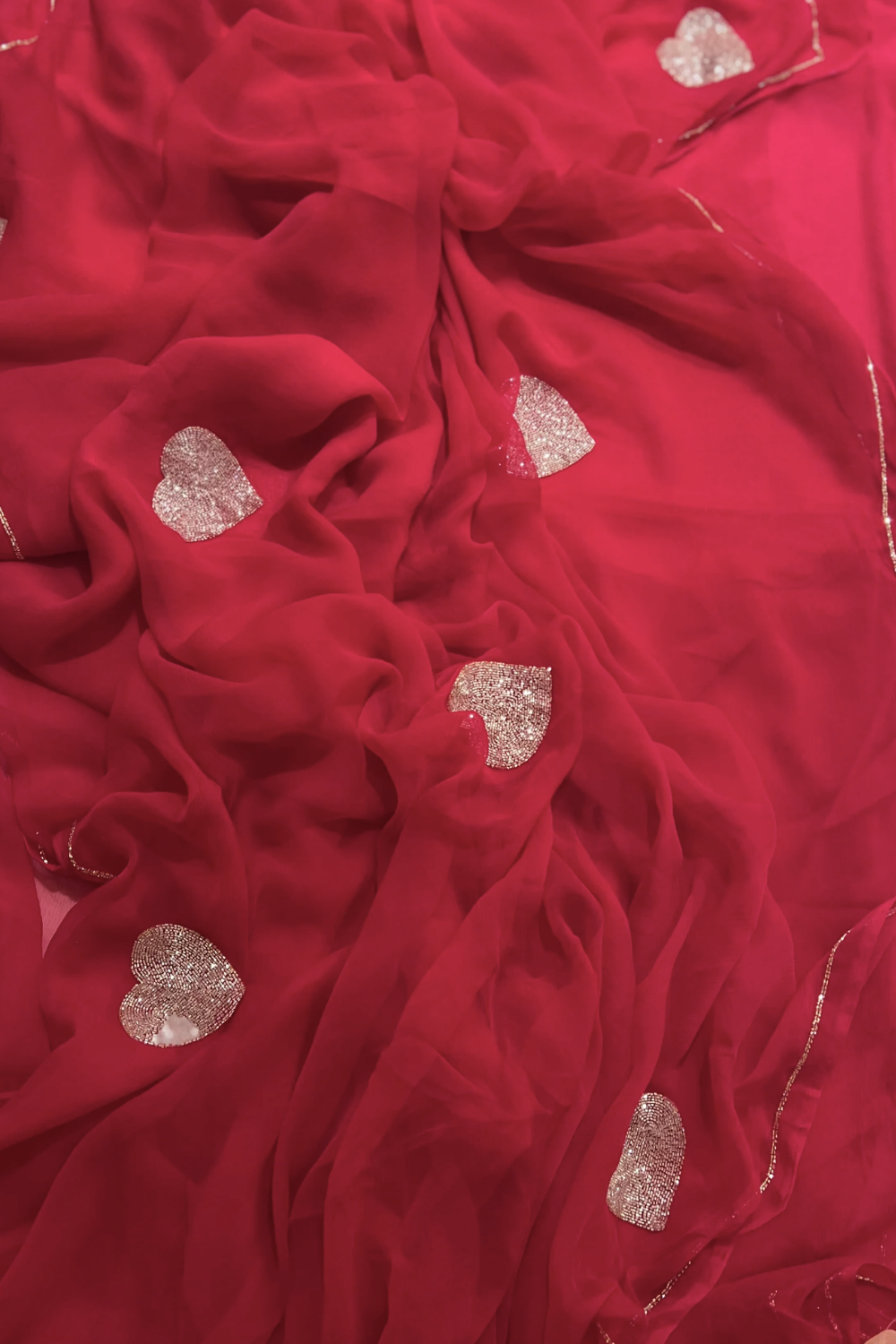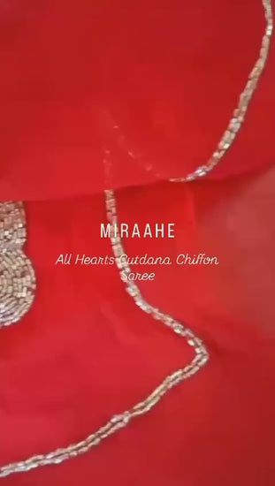 Indulge in the epitome of luxury with our All Hearts Cutdana Chiffon Saree. Handcrafted with 15 exquisite heart motifs, this saree boasts of pure chiffon fabric and intricate cutdana handwork. Elevate your style with this exclusive piece.