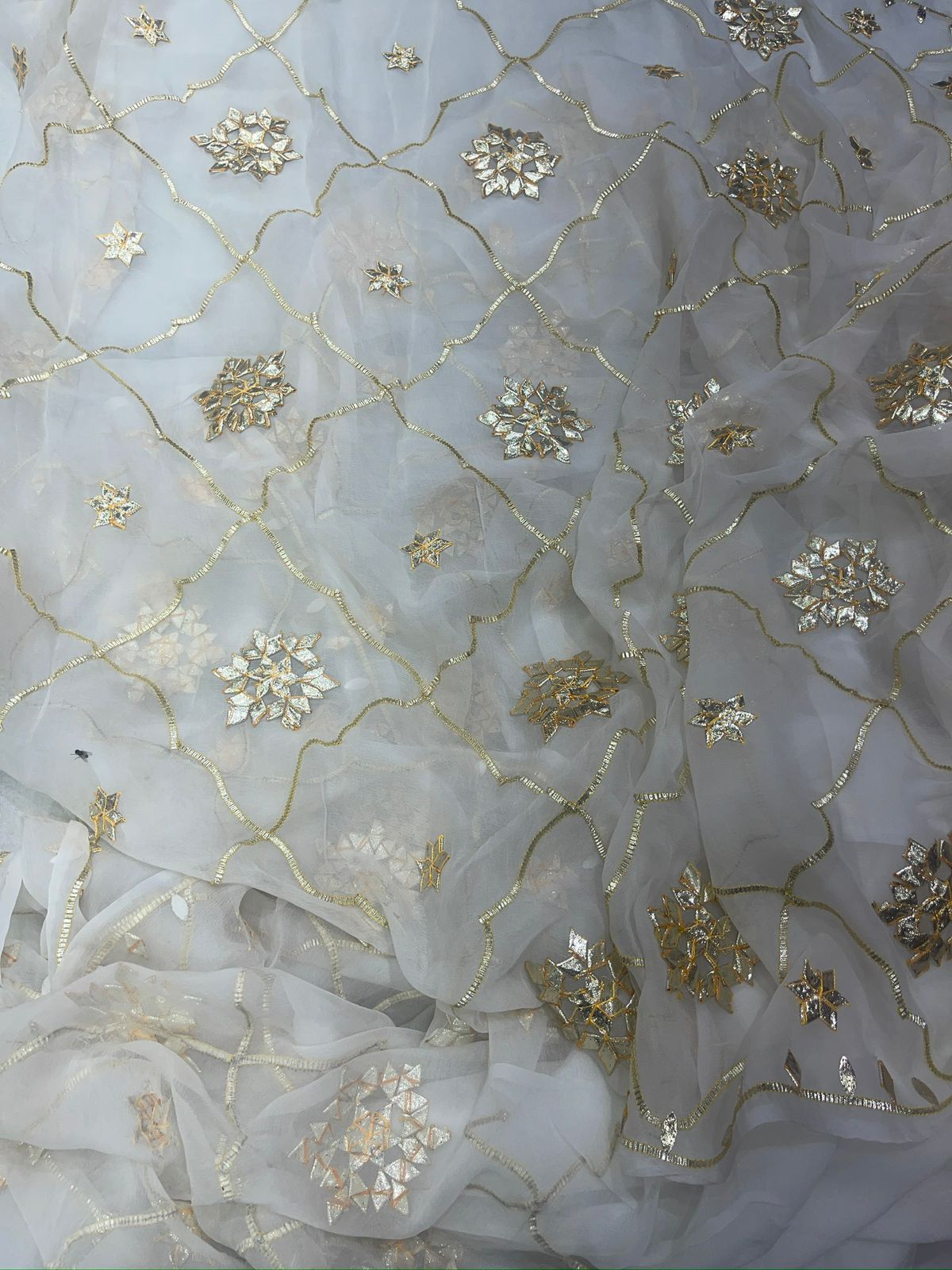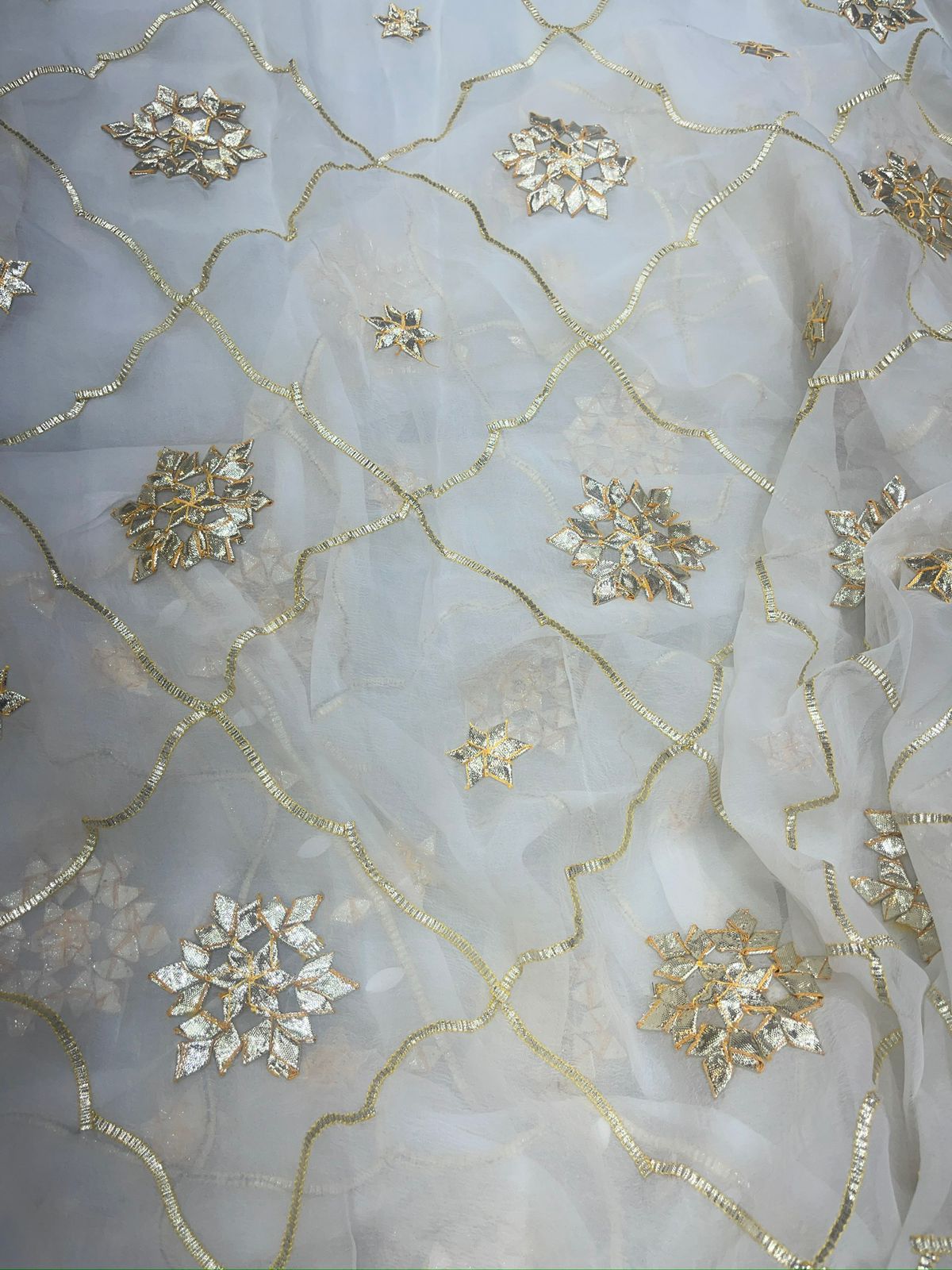 Elevate your elegance with the Ambrapali Gotta Zaal Chiffon Saree, featuring exquisite white and golden gotta work. Crafted with royal handwork, this saree blends delicate chiffon fabric with intricate detailing, perfect for sophisticated occasions. Its graceful drape and shimmering accents create a timeless look that embodies refined tradition and modern charm.