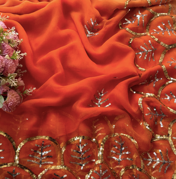 Elevate your ethnic wardrobe with this stunning orange ombre sequin border saree, crafted from premium heavy chiffon fabric. The gradient sequin detailing along the border creates a mesmerizing visual effect, transitioning seamlessly through warm orange tones. The substantial chiffon drape offers both elegance and comfort, making it ideal for weddings, festive celebrations, and special occasions. The luxurious weight ensures the saree maintains its graceful silhouette throughout the day, while the intricate sequin work adds sophisticated glamour. Perfect for those who appreciate refined craftsmanship and timeless style.