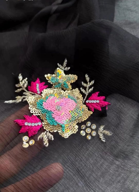 Pure Diamond chiffon saree elevated with beautifully hand embroidered 15 motifs using cut dana and sequins. This unique combination of colourful threads on black chiffon fabric comes with a running blouse piece, with light work on the sleeves.
