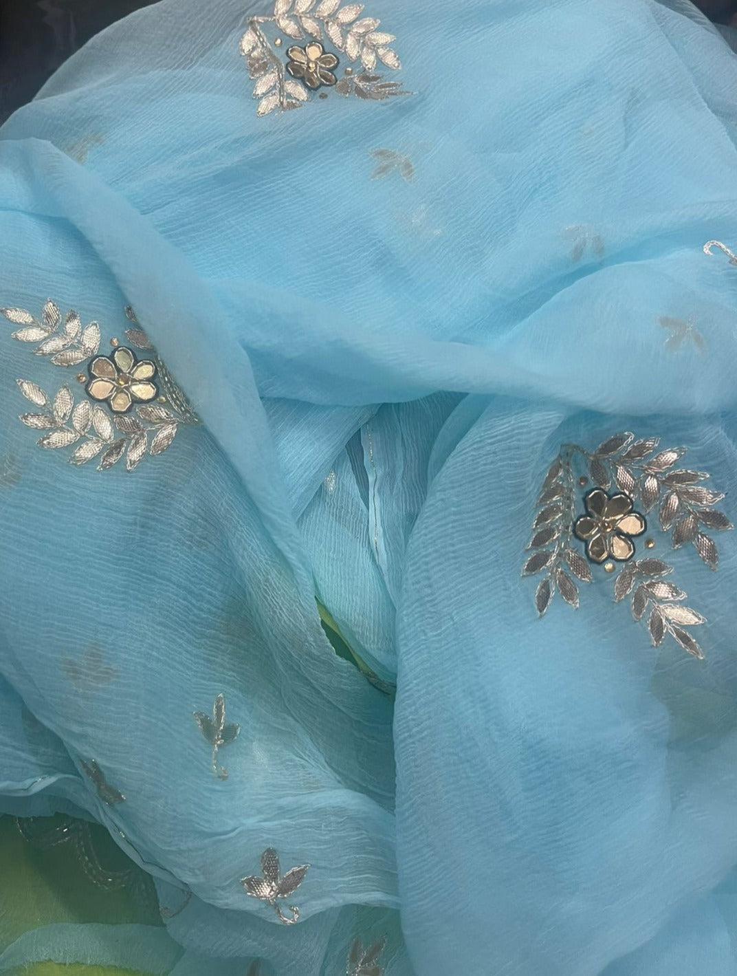 Expertly crafted with soft diamond chiffon fabric, the Blue Lagoon Saree features beautiful gotta patti with 13 motifs handwork for an elegant touch. Perfect for any occasion, this saree offers a comfortable fit and sophisticated style. Elevate your wardrobe with this timeless piece.