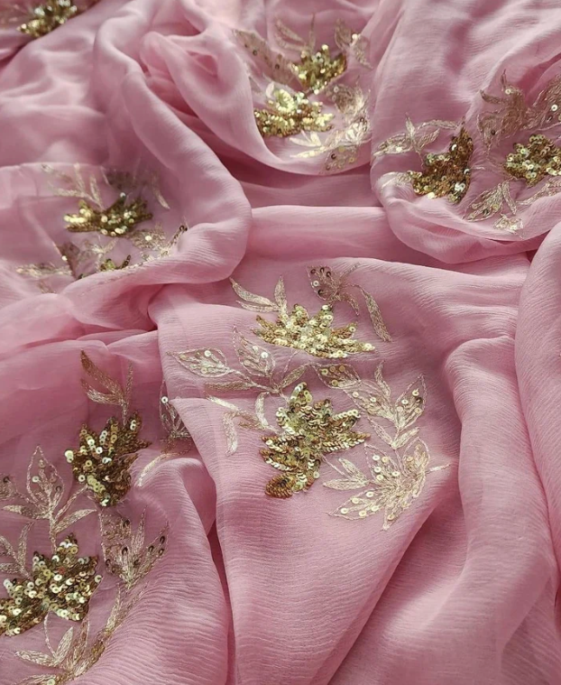 Introducing our Chameli Pure Chiffon Saree, featuring stunning shades of pink adorned with delicate handwork sequins in a lovely floral design 13 booti. Embrace elegance and luxury with this exclusive saree, perfect for any special occasion. Elevate your style and make a statement with this pure chiffon masterpiece.