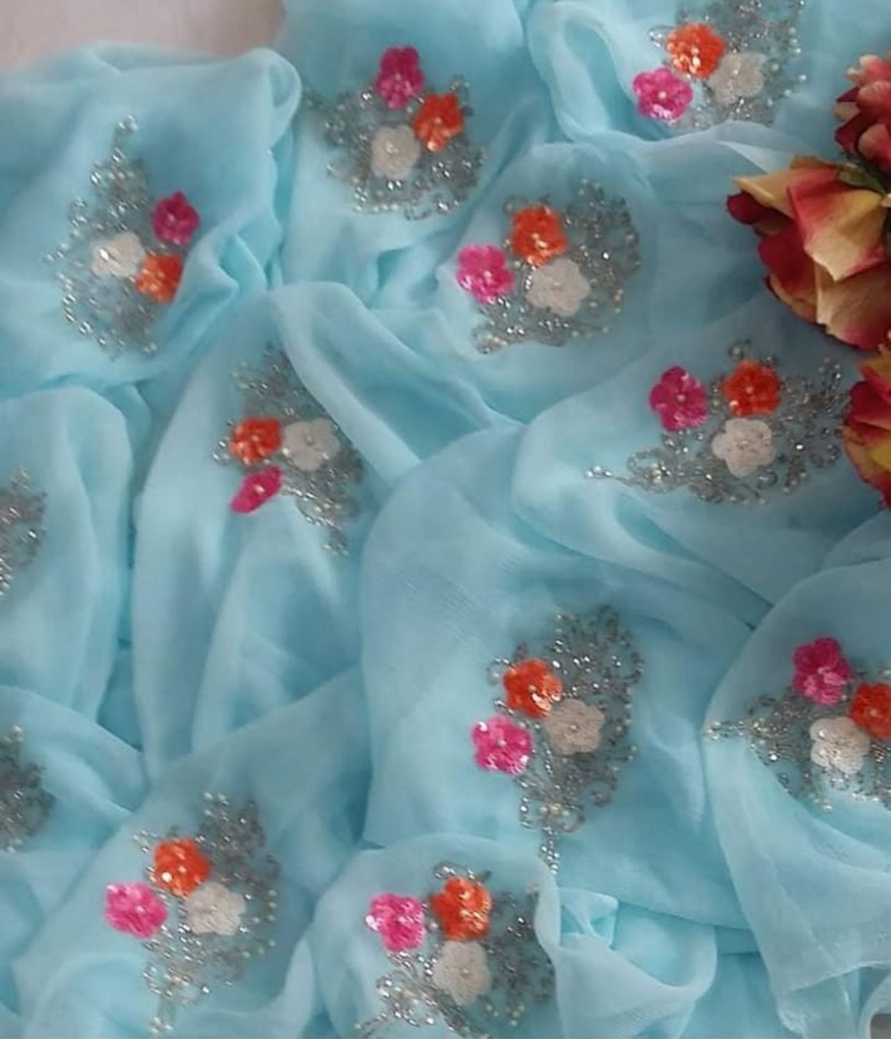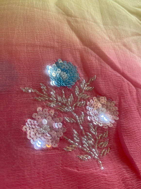 Elevate your style with our Colorpop Pure Diamond Chiffon Saree. This elegant saree features intricate floral bead-cut Dana & pearl handwork and a beautiful kinara border. Made with pure chiffon, it will add a touch of grace and charm to any occasion.
