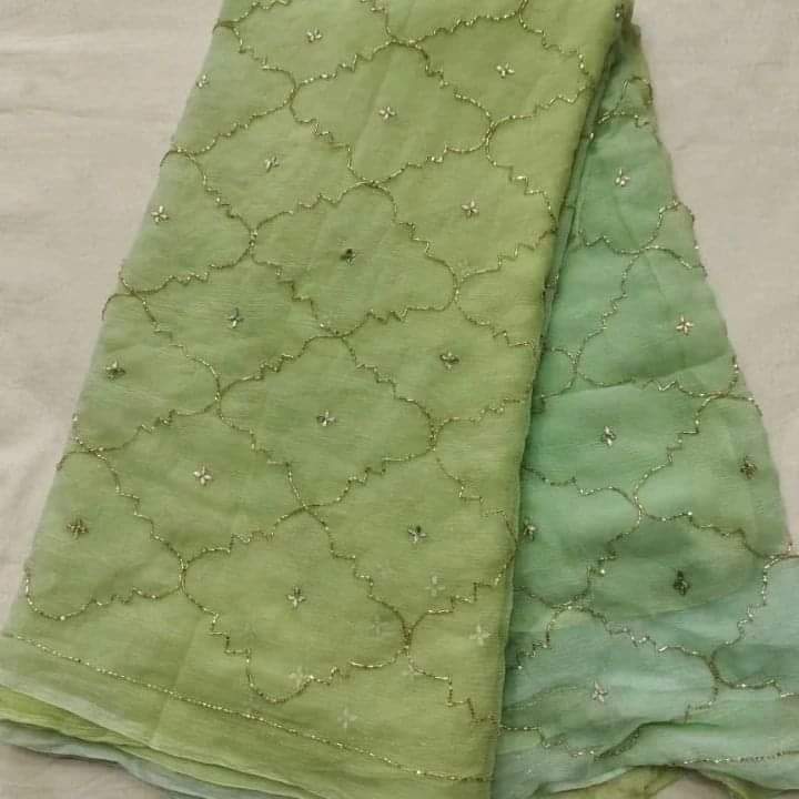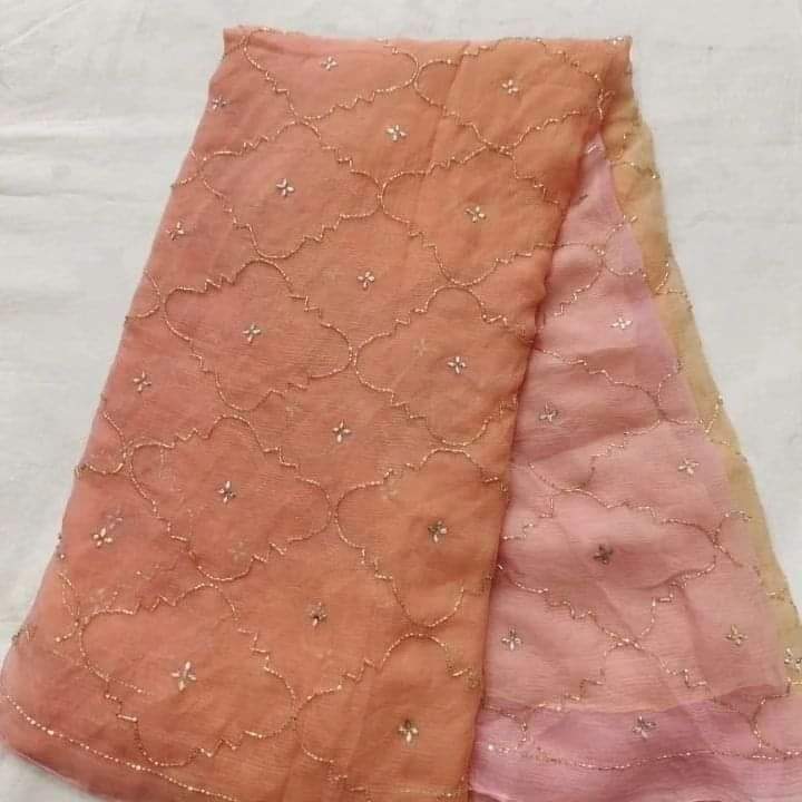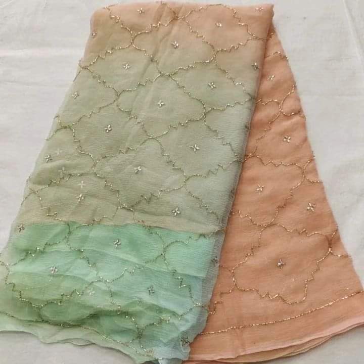Add a touch of elegance and sparkle to your wardrobe with our Diamond Chiffon Ombre Saree. Made from high-quality diamond chiffon, this saree features a beautiful ombre design with delicate beads that adorn the entire fabric. Perfect for any occasion, make a statement with this unique and eye-catching saree.