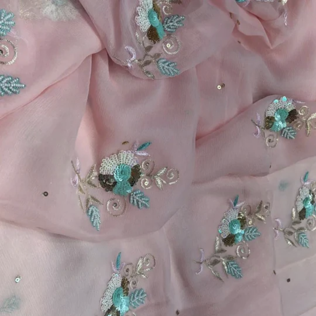 Add sparkle to any occasion with the Falan Chiffon Saree. Intricate details such as beads and sequins handwork 15 motifs on pure diamond chiffon fabric create a luxurious and elegant look. Each saree features a unique pastel shade, making it a one-of-a-kind addition to your wardrobe.