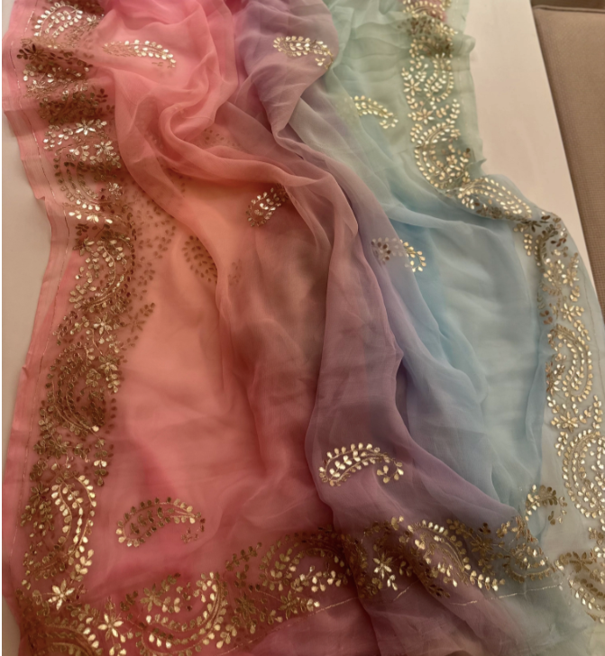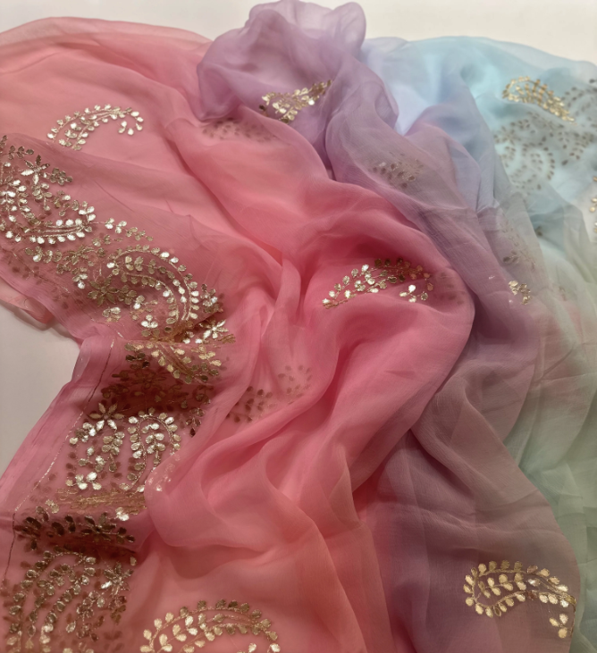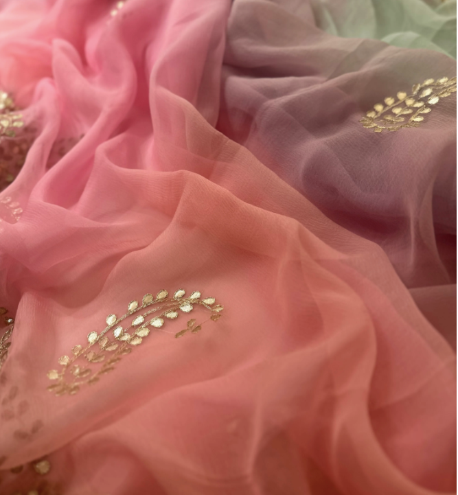 This Gotta Patti Kairi saree blends delicate pastel hues with lightweight chiffon fabric, creating an elegant and refined silhouette. The intricate Gotta Patti work adds a traditional charm, while the subtle kairi design enhances its sophisticated appeal. Perfect for festive occasions or formal gatherings, this saree offers both comfort and grace for a timeless look.