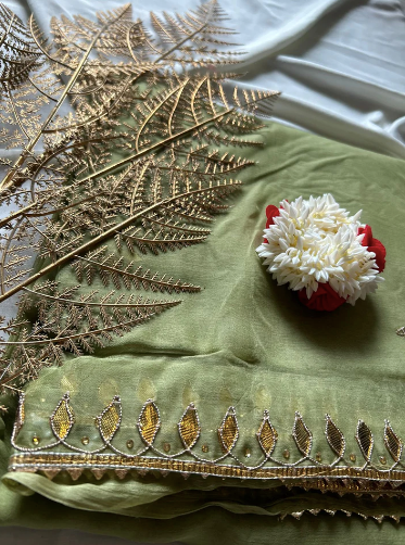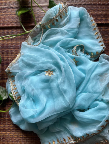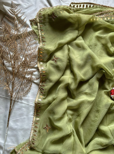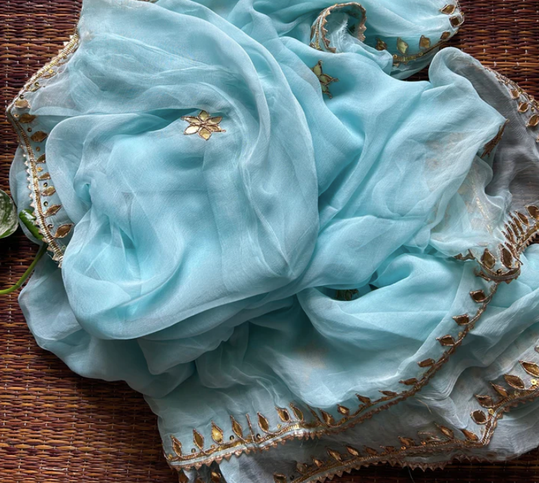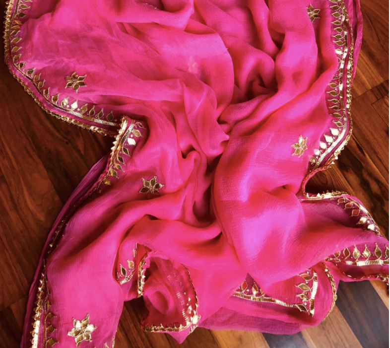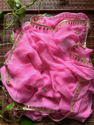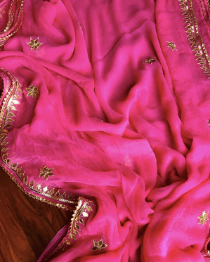Indulge in luxury with our Gulab Gotta Patti Pure Chiffon Saree. Handcrafted with intricate gotta patti work, this saree exudes elegance and sophistication. The pure chiffon fabric drapes beautifully, making you feel like a piece of art. Elevate your wardrobe and make a statement with this exclusive saree.