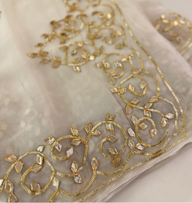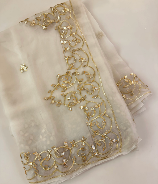 Elevate your ethnic wardrobe with this exquisite chiffon fabric featuring an intricate kachi gotta spiral design border. Hand-embellished with delicate diamond-shaped gotta patti work, each piece showcases traditional craftsmanship and timeless elegance. The lightweight chiffon drapes beautifully, making it perfect for sarees, dupattas, or contemporary fusion wear. The ornate spiral motif combined with shimmering gotta detailing creates a refined aesthetic that transitions seamlessly from festive occasions to special celebrations. A sophisticated choice for those who appreciate authentic handwork and classic Indian artistry.