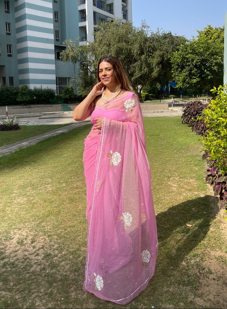 Indulge in luxury with the Kalyani Puri Chiffon Saree. Crafted from pure chiffon, this chic saree features delicate, dense handwork of pearl sequins and 15 roses butti, adding a touch of elegance to any occasion. Experience the artistry and beauty of this exclusive piece.