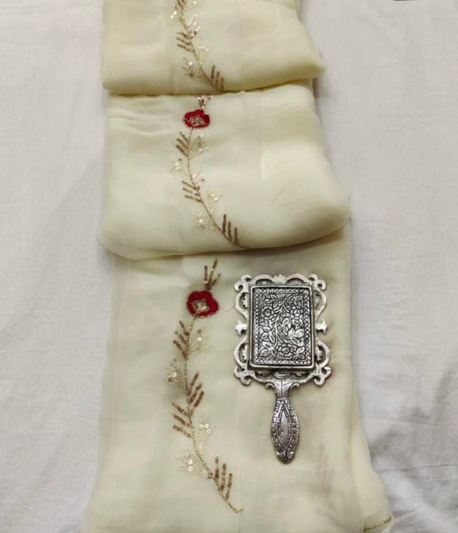 Kimaya is an elegant addition to your wardrobe. Made of pure diamond chiffon, it features an intricate handcrafted with sequin threadwork stem design in an off-white color. Perfect for any special occasion, this dress exudes sophistication and luxury.