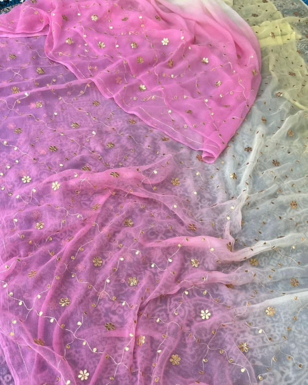 Pure Diamond chiffon saree hand dyed in pastel multicolour shades, elevated with beautifully embroidered zaal using Gotta Patti and thread work. The Beautiful pastel shade of the saree comes with a running blouse piece, with light work on the sleeves.