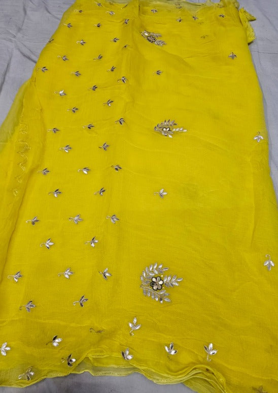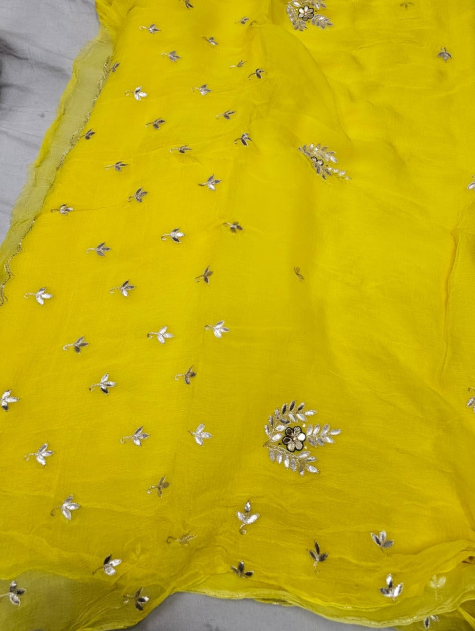 Expertly crafted with soft Pure Diamond Chiffon fabric, the yellow Saree features a beautiful gotta patti with 13 motifs and various small botti handwork for an elegant touch. This saree is perfect for any occasion and offers a comfortable fit and sophisticated style. Elevate your wardrobe with this timeless piece.