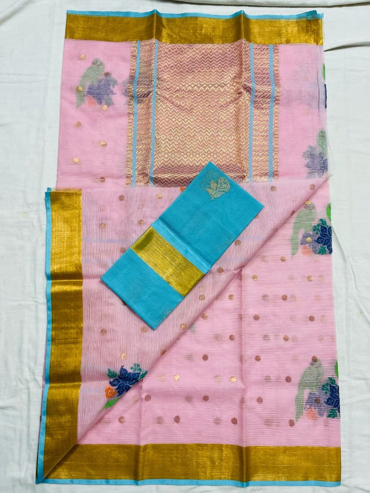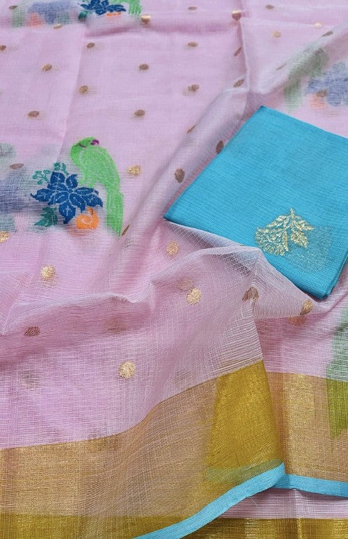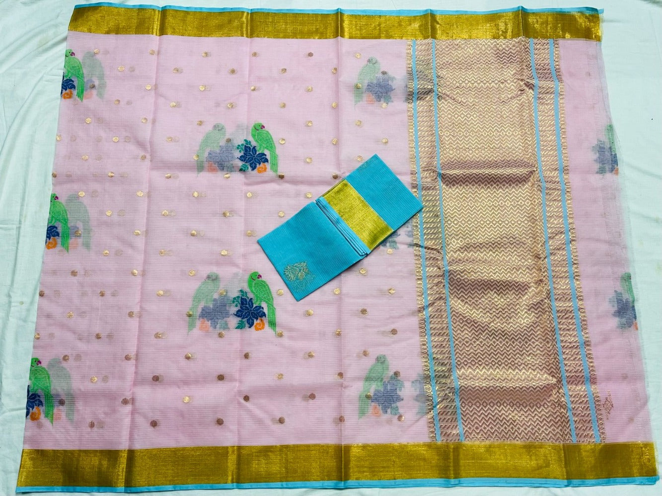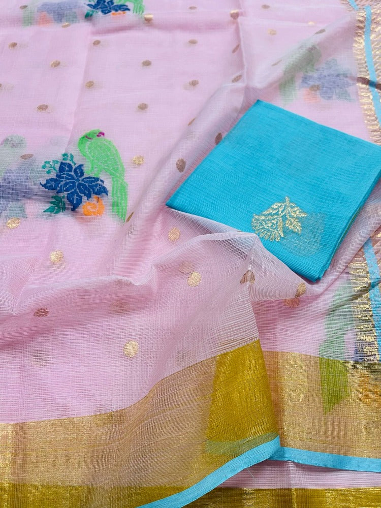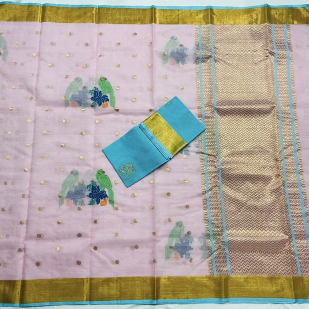 Experience elegance and tradition with the Mrunal Handwoven Saree. Adorned with intricate handwork parrot design and botti all over, this saree boasts a beautiful golden zari pallu for added elegance. Complete the look with the contrasting blue blouse. Perfect for any special occasion.