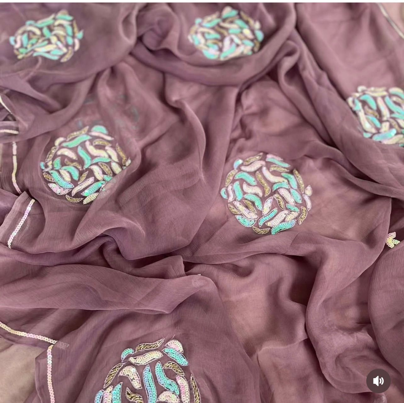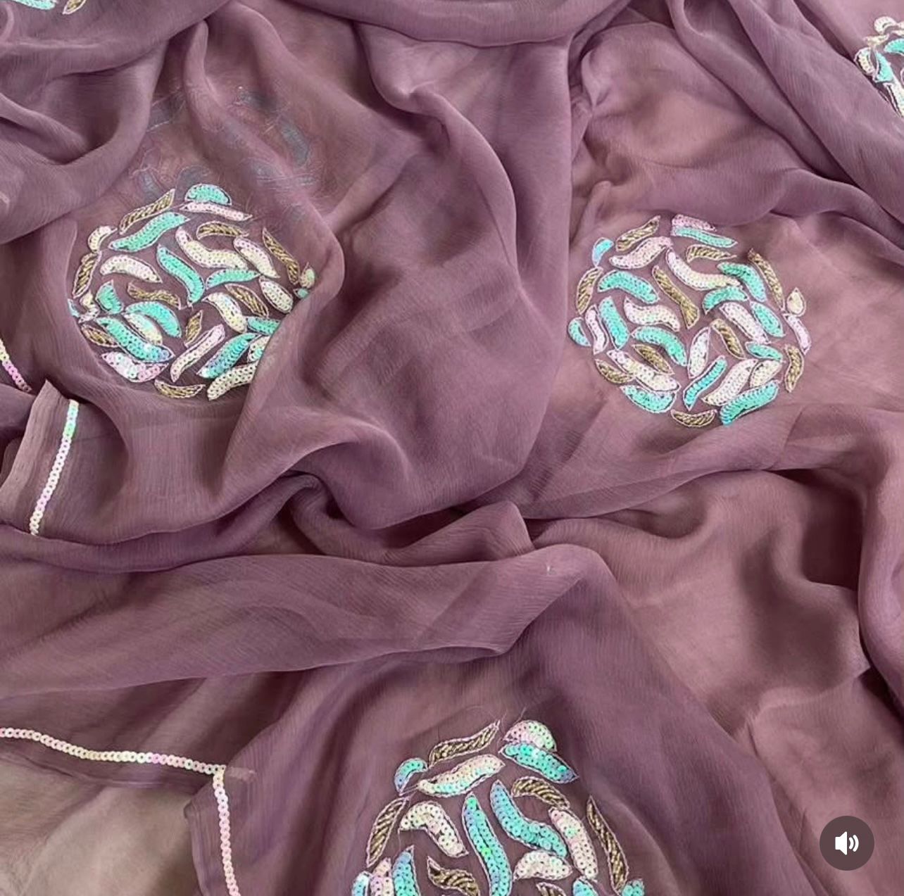Elevate your style with our Nivi Pure Diamond Chiffon Saree. This elegant saree features intricate Sequins floral handwork and a beautiful kinari border. Made with pure chiffon, it will add a touch of grace and charm to any occasion.