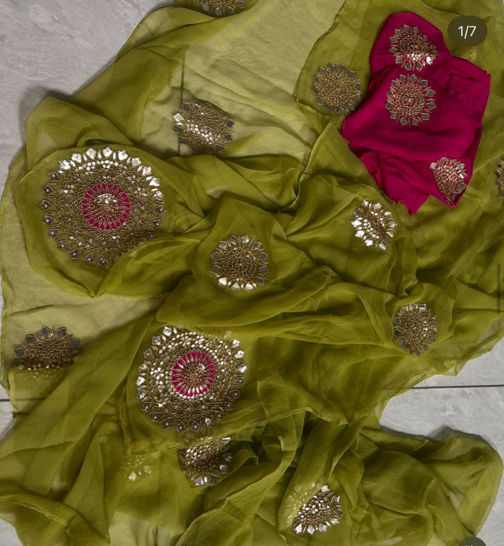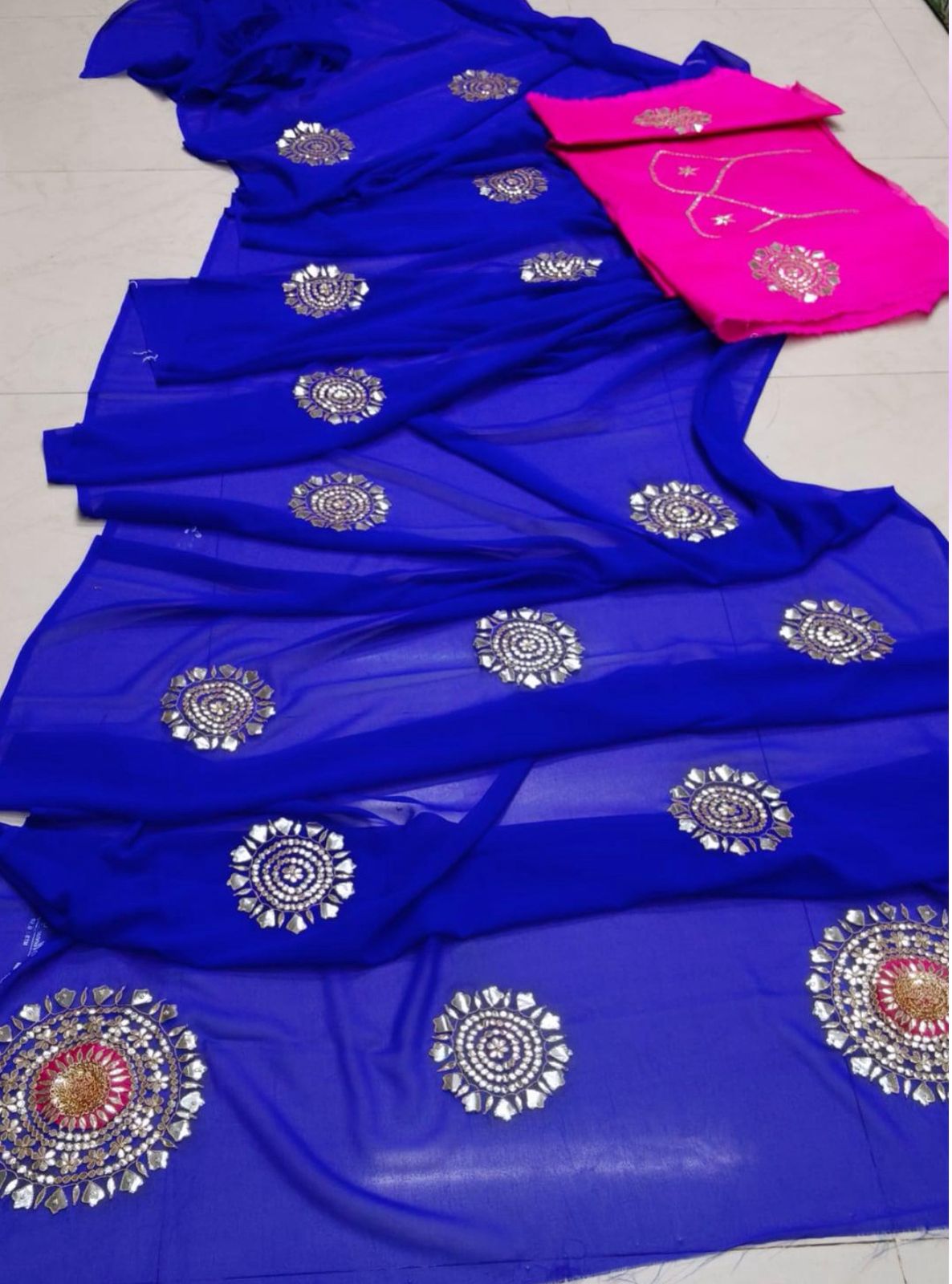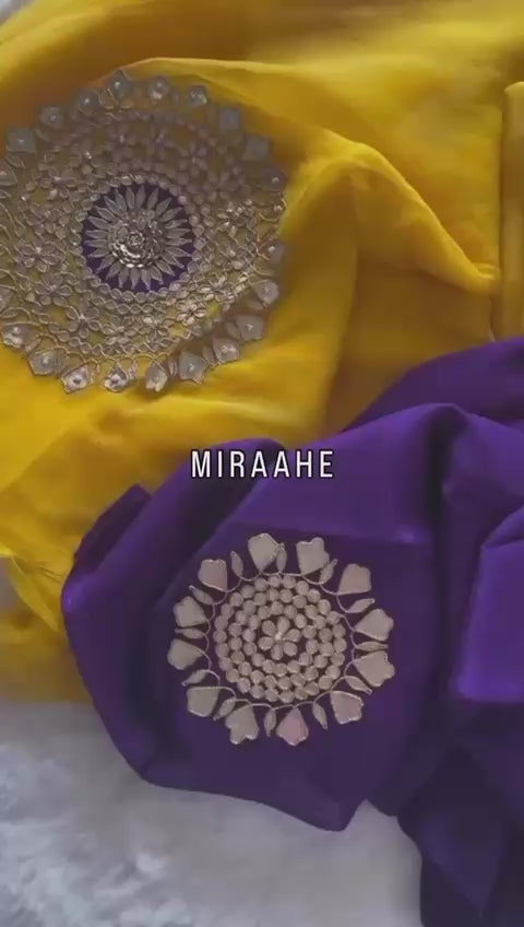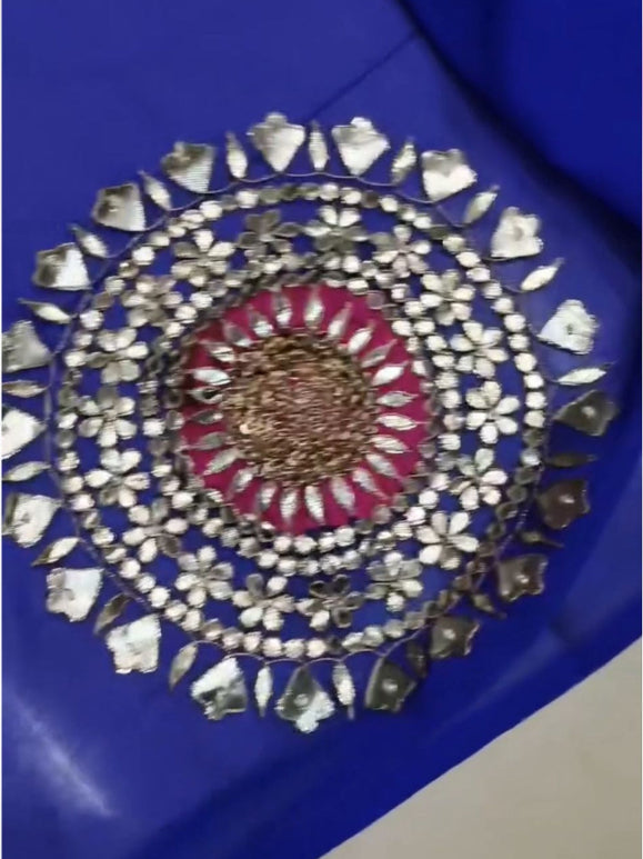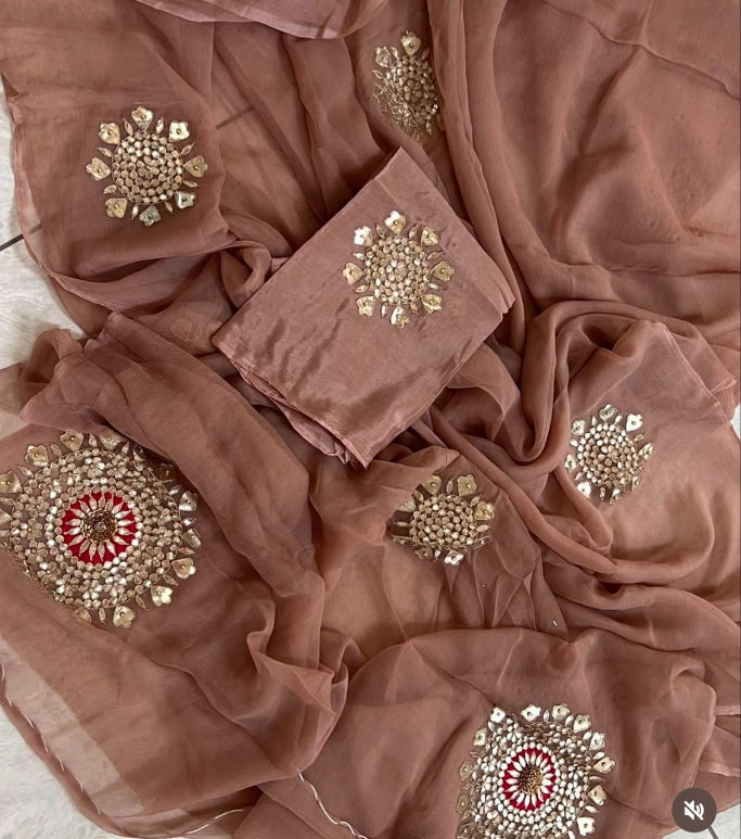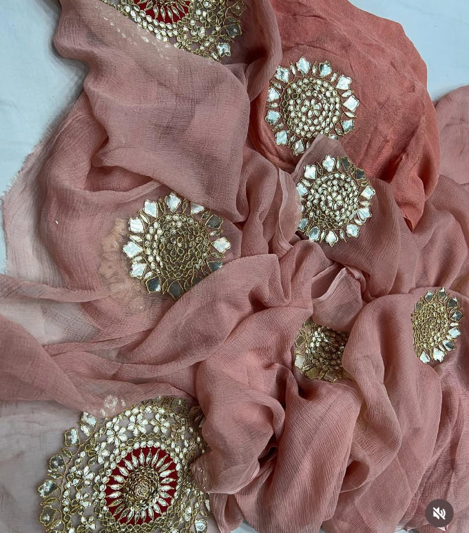 Diamond chiffon saree detailed with beautiful hand embroidered Zardosi, gota patti, pearls and marodi detailed motifs . The end of the palla has 2 big motifs on each side, and the rest of palla and skirt are laden with 9 medium-sized motifs. The saree comes with a running blouse piece with buta work on sleeves.