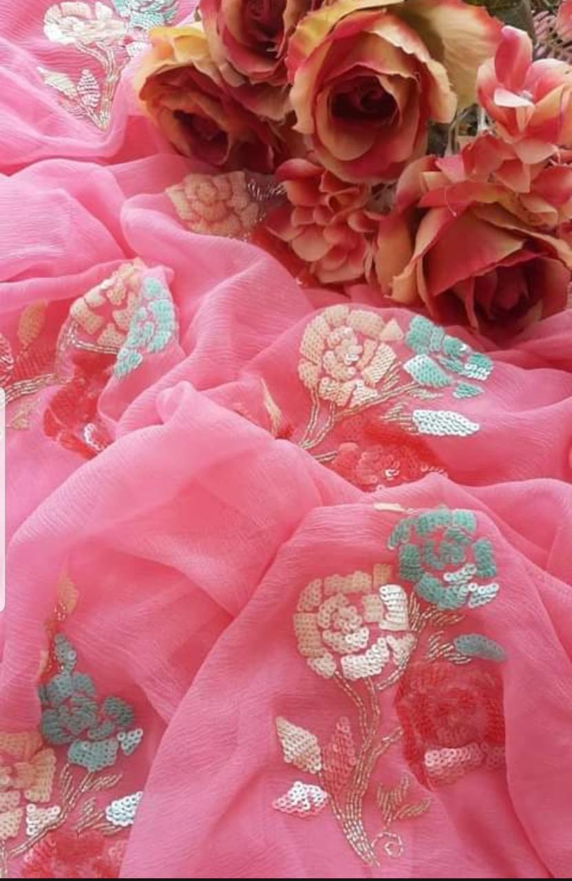Expertly crafted from Pure Diamond chiffon, the Peach Rose Saree boasts an elegant hand embroidered design of sequins and cut daana roses all over. The stunning saree also features 13 motifs of rose design, adding a touch of sophistication. Accompanied by a running blouse with light work on the sleeves, this saree is a must-have for any saree connoisseur.