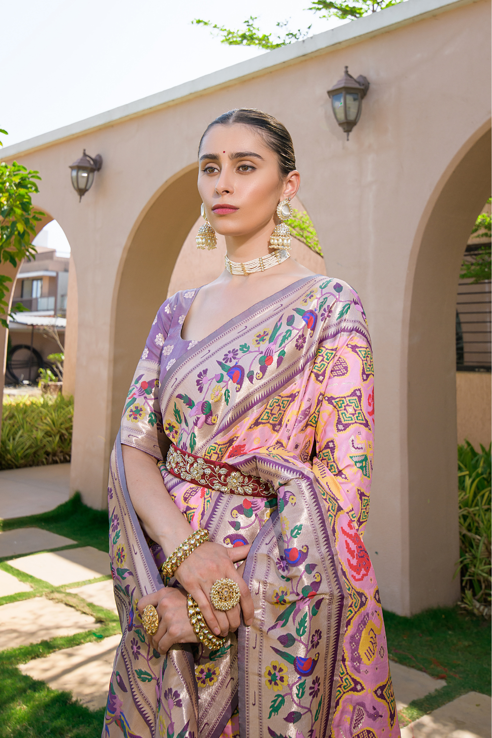 Elevate your style with our Pink Paithani Silk Saree. Crafted from luxurious Paithani silk, adorned with exquisite Meenakari and Zari woven designs, and finished with a shimmering Zari woven pallu. The 5.5-meter saree and 0.8-meter blouse add elegance and grace to any occasion. Indulge in the opulence of this exclusive saree.