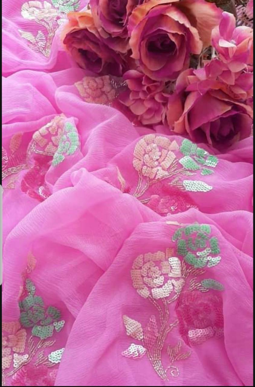 Pure Diamond chiffon saree enhanced with beautiful hand embroidered sequins and cut daana roses all over 13 motifs. The elegant saree comes with a running blouse with light work on the sleeves.