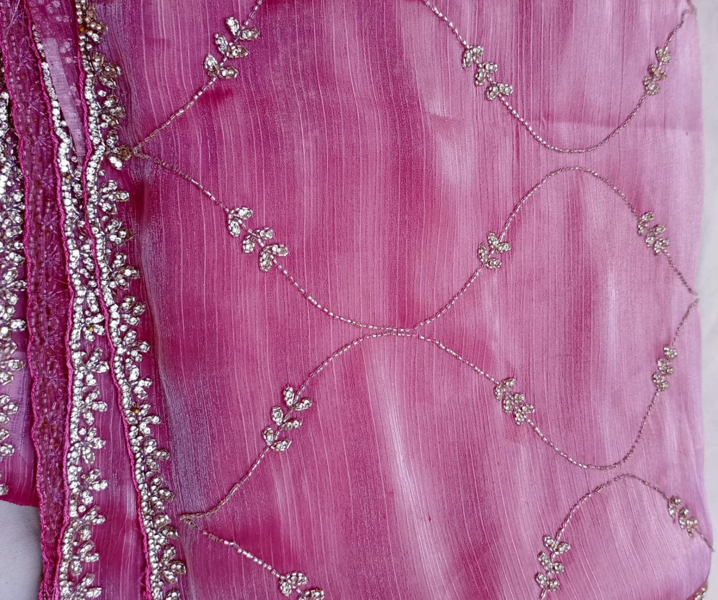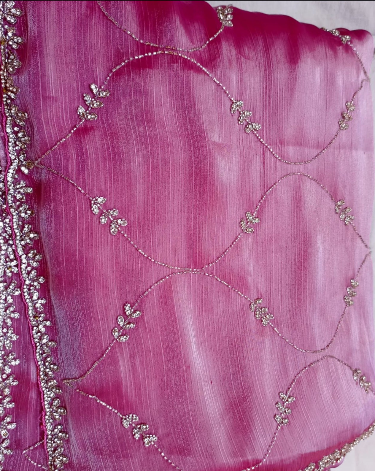 Expertly crafted with intricate handwork details and adorned with delicate beads, our Pink Tissue Saree is a stunning addition to any wardrobe. Made of premium quality tissue fabric, it offers a soft and comfortable drape while the elegant kinari and zaal accents add a touch of sophistication. Elevate your style with this timeless piece.