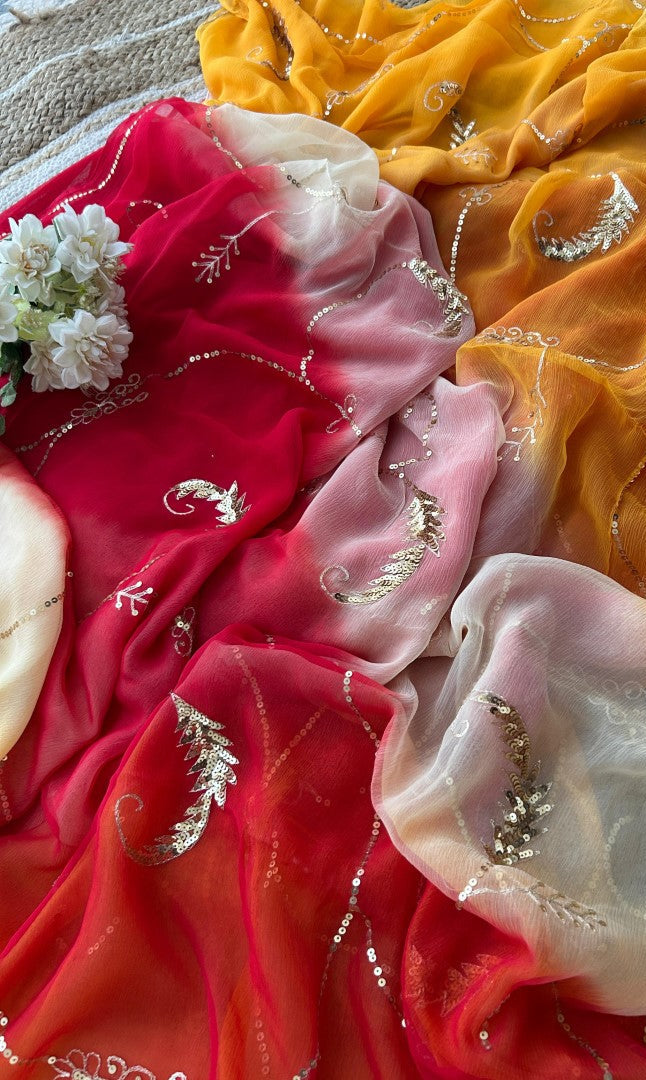 Experience refined elegance with the Rangat Ombre Sequins Chiffon Saree, a masterfully crafted piece that exemplifies contemporary ethnic wear. The sophisticated kairi zaal design showcases a carefully curated ombre gradient that transitions seamlessly across the fabric, demonstrating superior color coordination and visual depth. Premium chiffon construction provides optimal drape and breathability, ensuring both comfort and aesthetic appeal throughout extended wear.