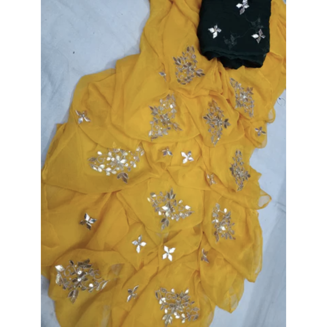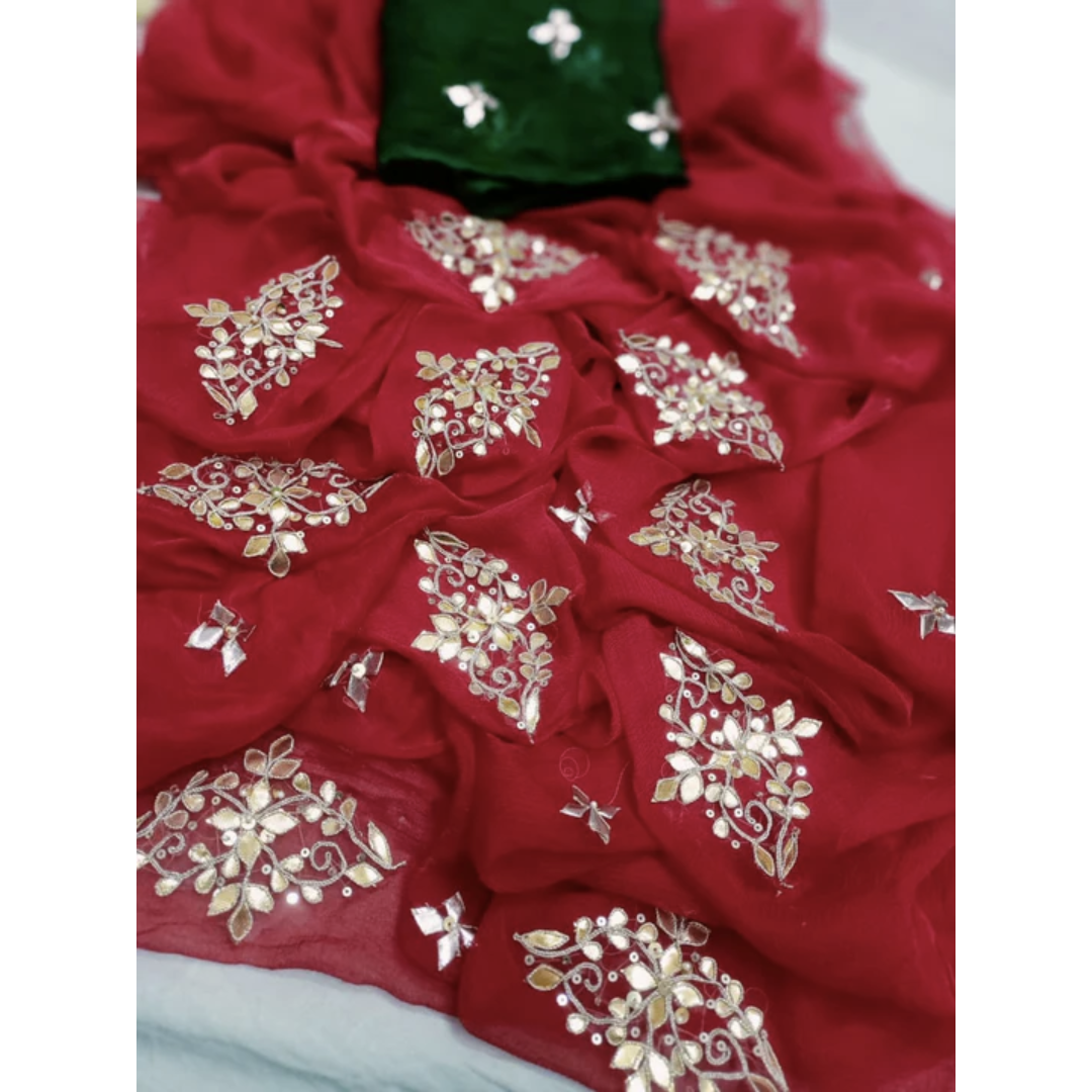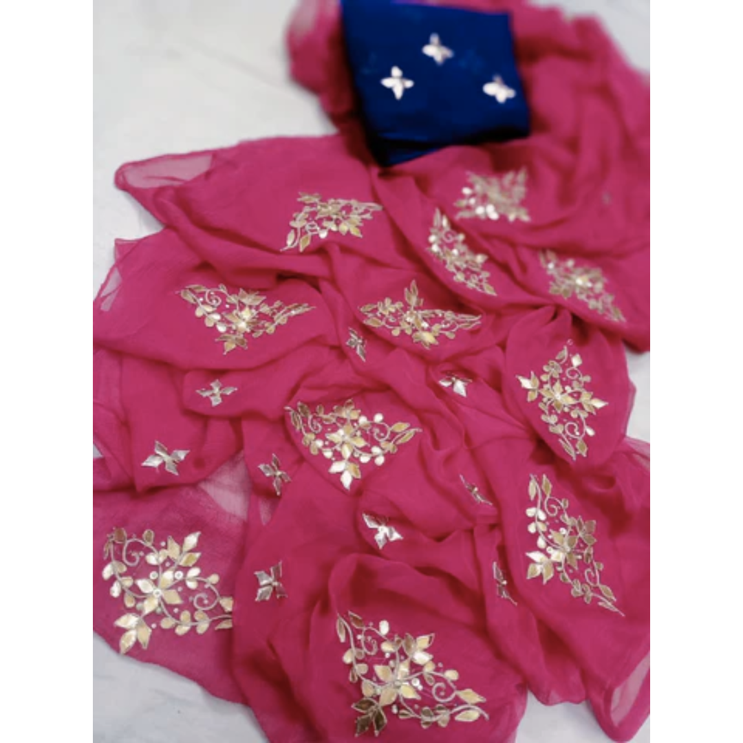 This elegant Rania Gotta Pure Diamond Chiffon Saree features 13 gotta patti motifs and delicate butti designs, and contrast blouse adding a touch of sophistication to any occasion. The beautiful color and pure diamond chiffon fabric make it a must-have for any fashion-forward wardrobe. Elevate your style with this stunning saree.