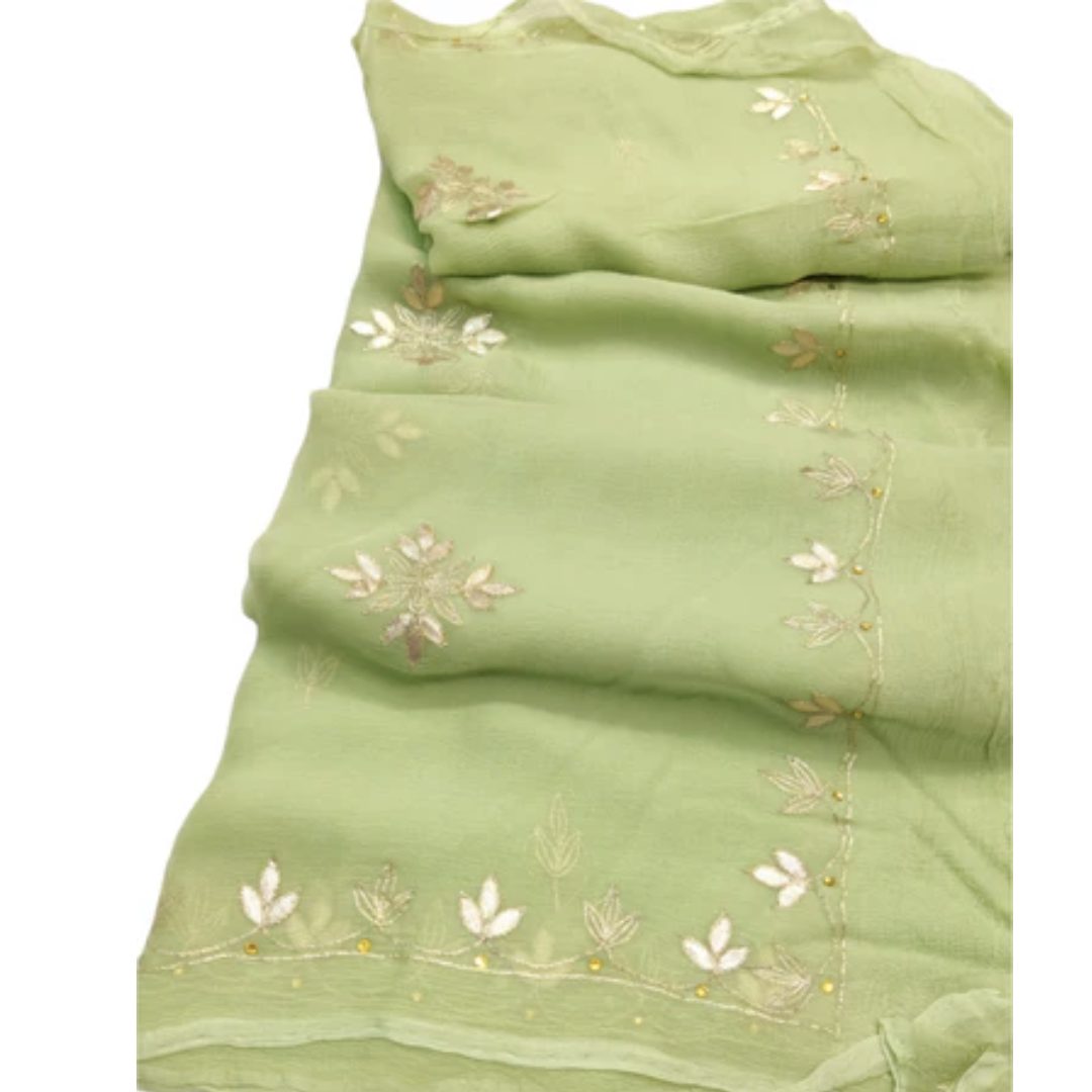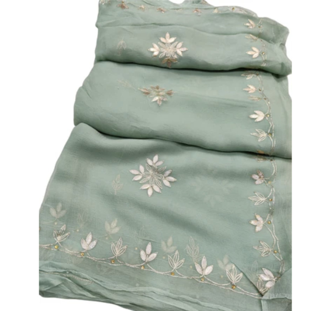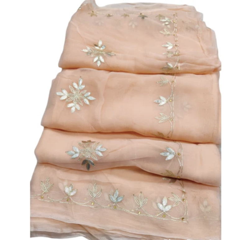 Expertly crafted with pure diamond chiffon in a soft pastel color, this Rati Gotta Patti saree boasts 13 motifs and a stunning gotta patti border. Elevate your style with this elegant and luxurious saree, perfect for any occasion.