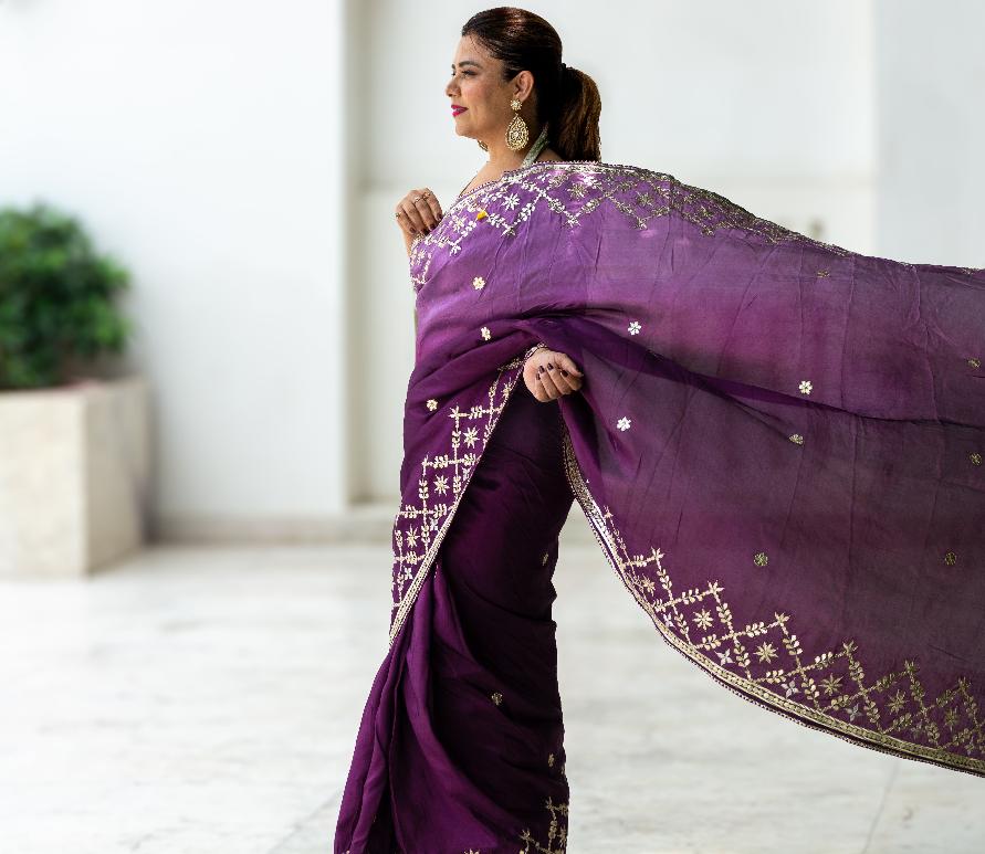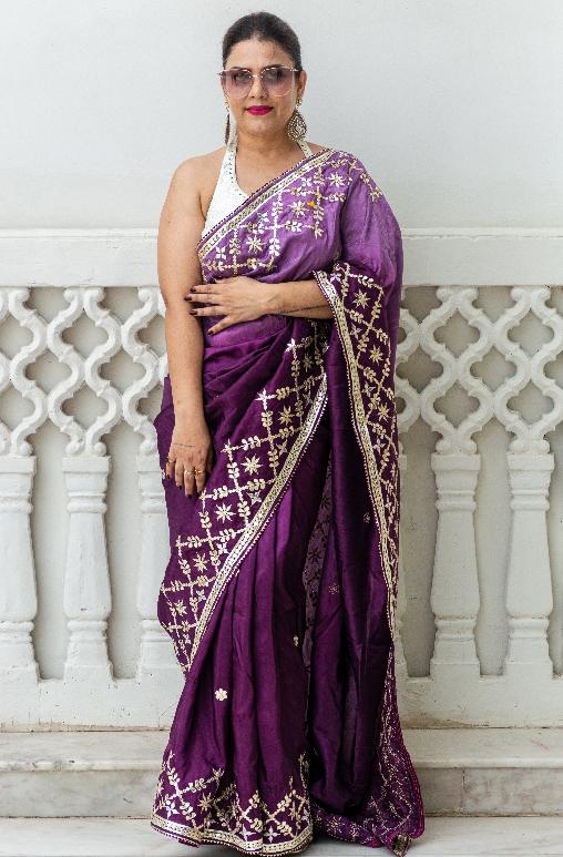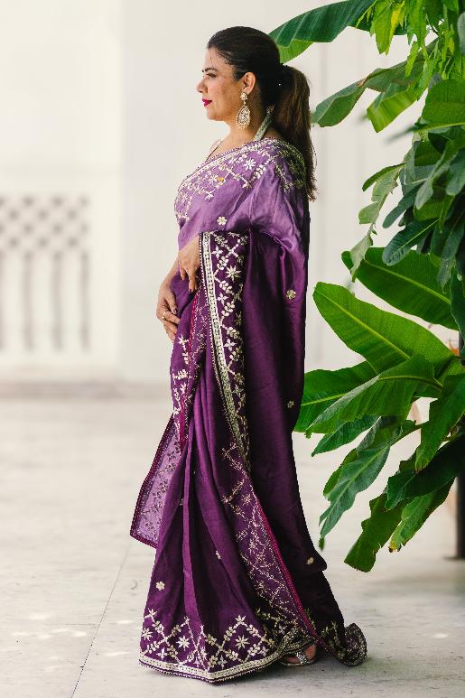 Introducing the Raznah Chiffon Saree, a luxurious Banarasi silk saree with a stunning ombre purple hue and intricate gotta Patti handwork along the border. Elevate your style with this exclusive piece, perfect for elegant occasions. Experience the art of Banarasi silk in this masterpiece.