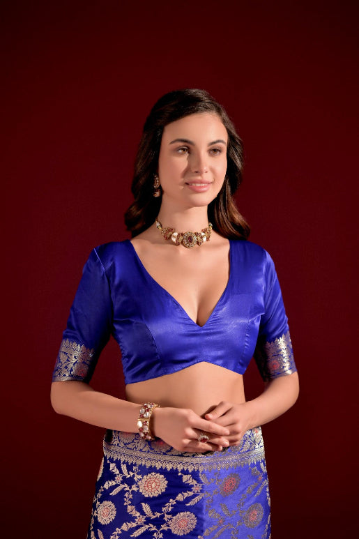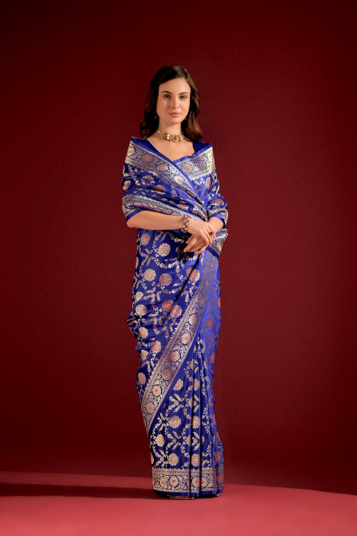 Indulge in luxury with our Banarasi Silk Saree. Featuring a beautiful printed floral border with zari woven pallu & zaal, this saree exudes elegance and sophistication. The intricate Banarasi silk fabric adds a touch of opulence to your wardrobe. Elevate your style with this exquisite piece.