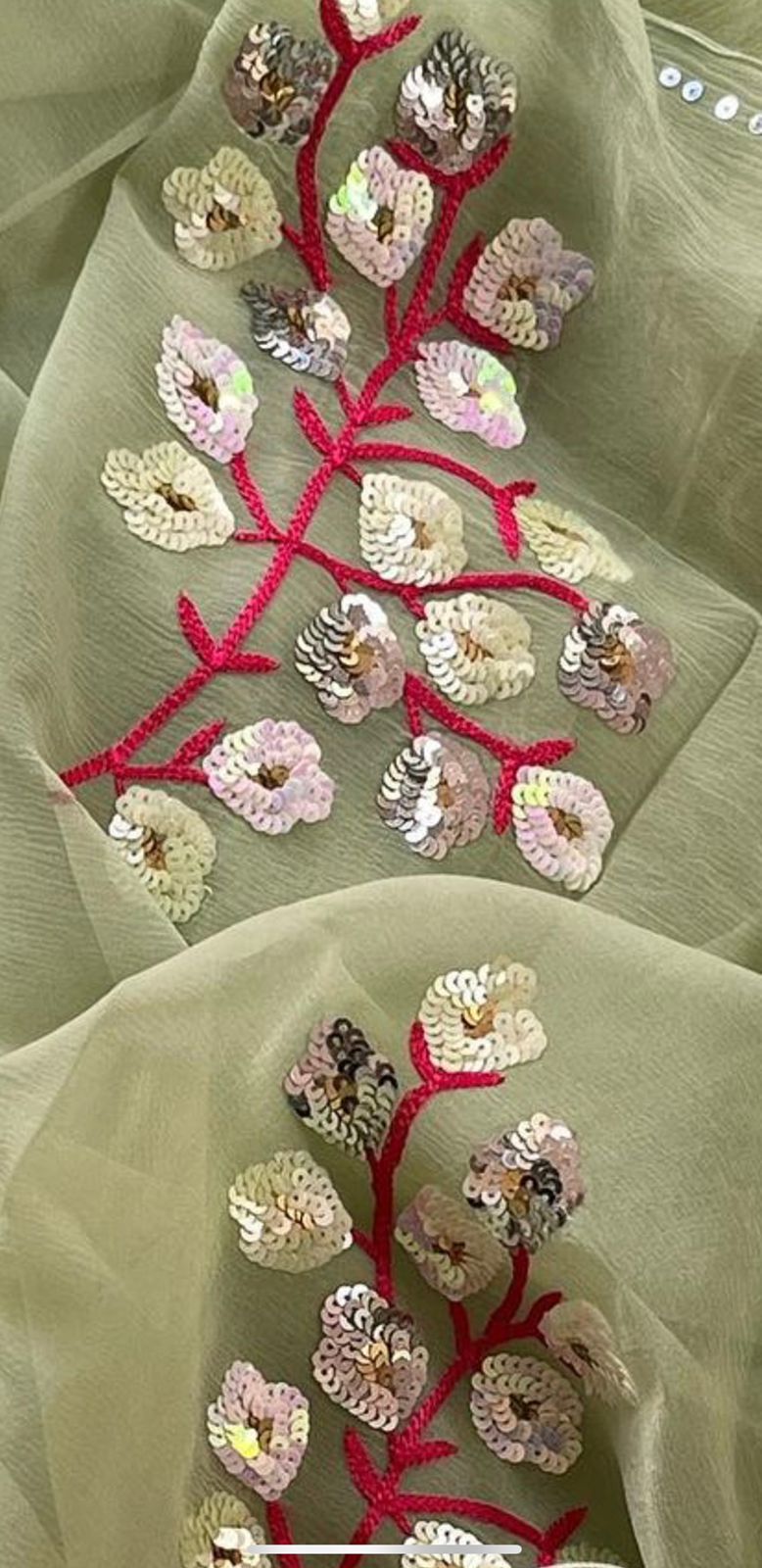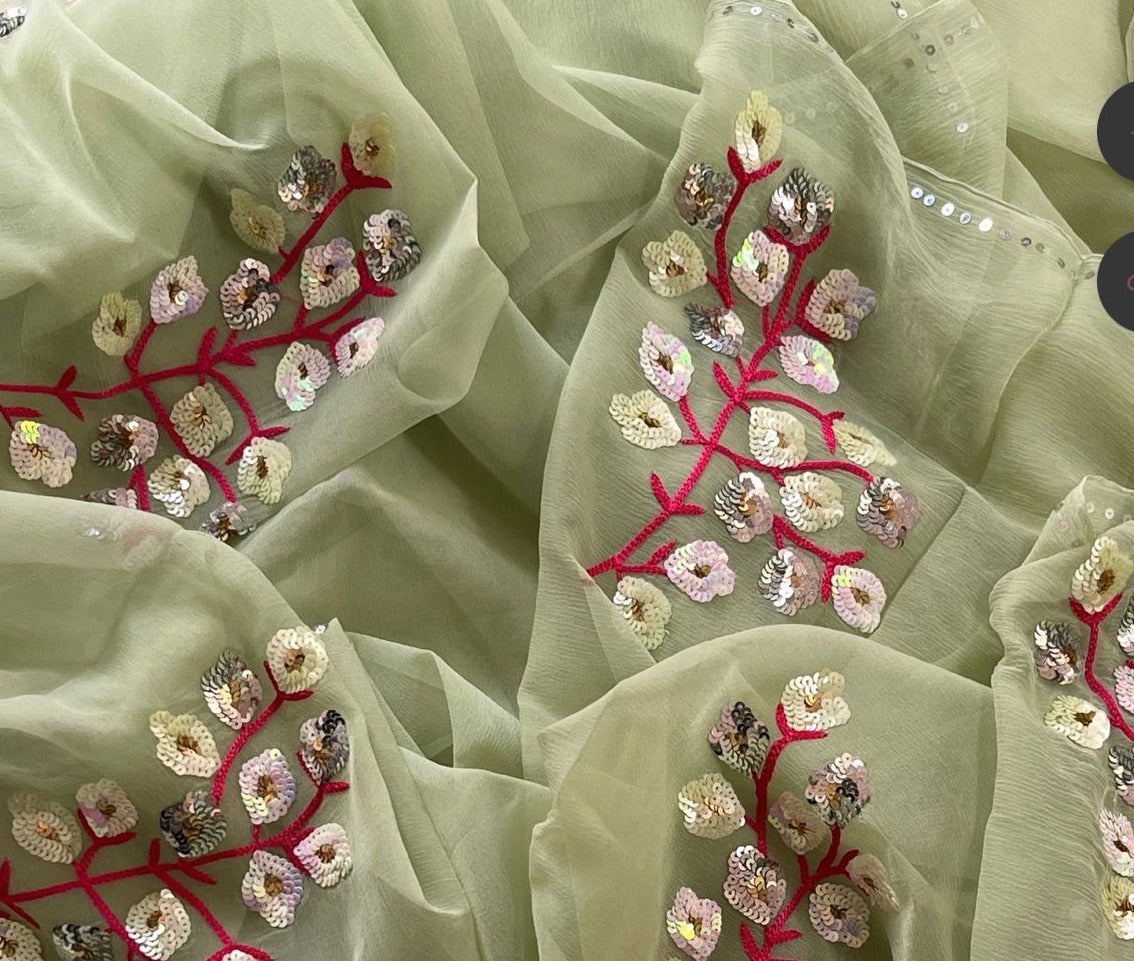 Soft pastel shades of sea green are hand-dyed to perfection, accentuated with intricate sequins and thread embroidery with 13 motifs. Embody grace and simplicity with this saree. Includes a matching blouse piece with minimal sleeve work. Elevate your style with our elegant pure Diamond chiffon saree.