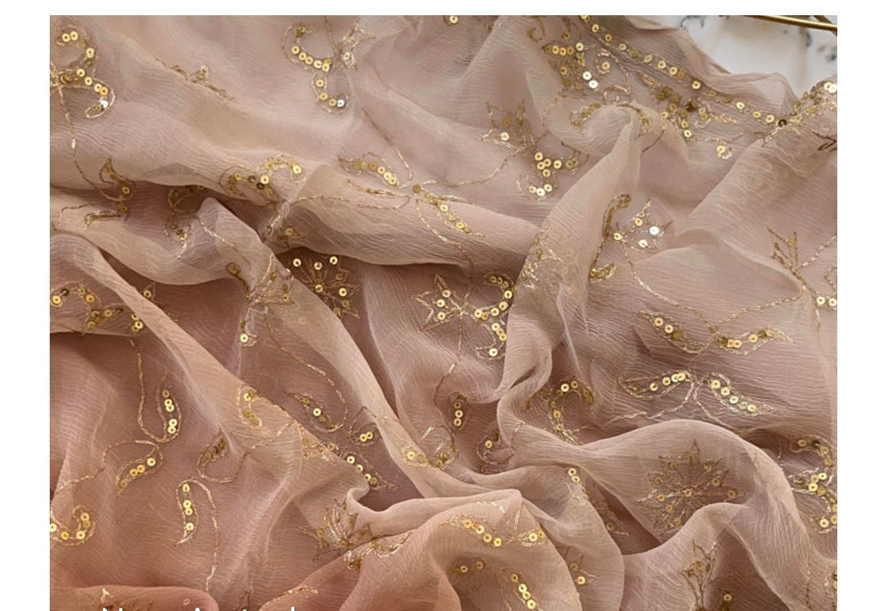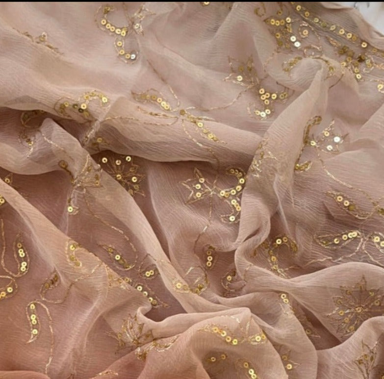 Experience elegance and luxury with the Sitara Saree. This soft pastel saree is delicately decorated with sequins all over pure diamond chiffon, giving it a touch of tradition and elegance. Perfect for special occasions, this saree will make you stand out with its sophisticated and stylish design.