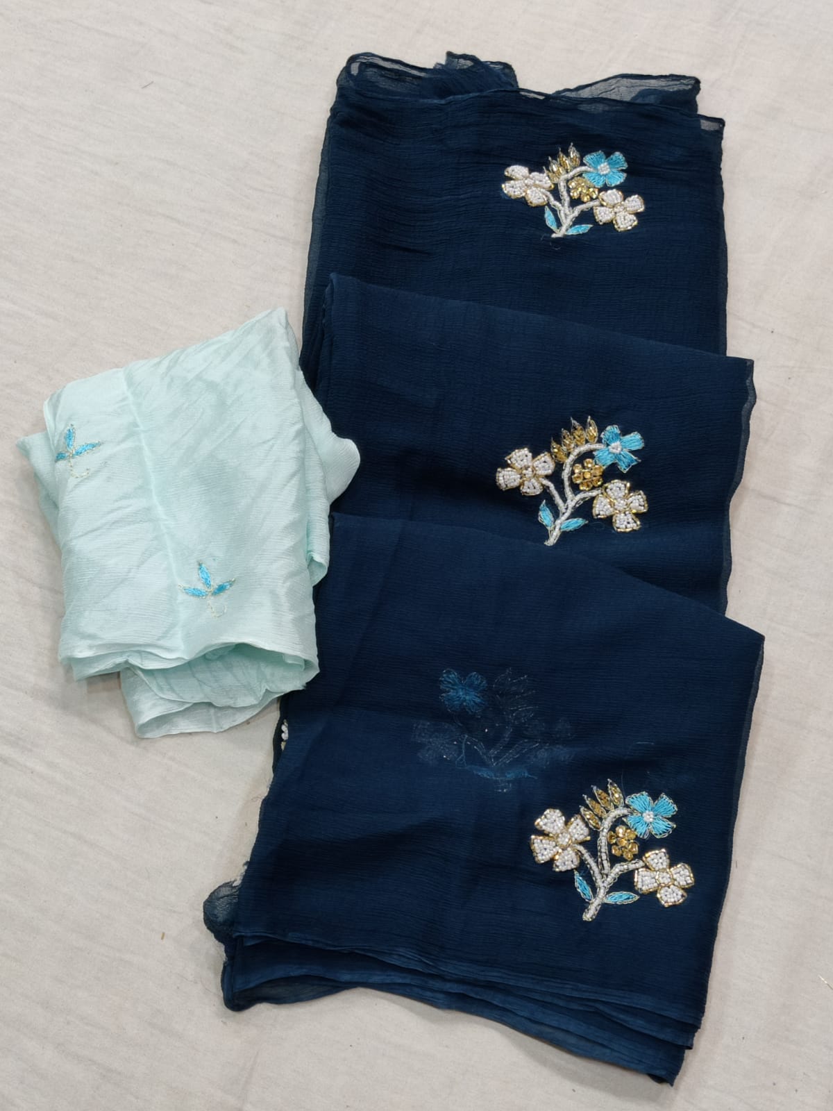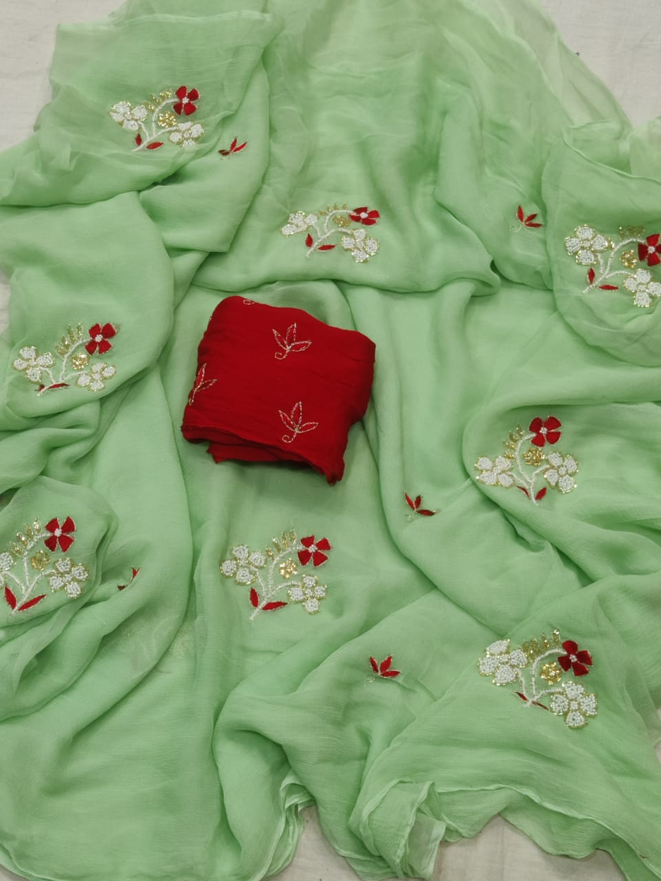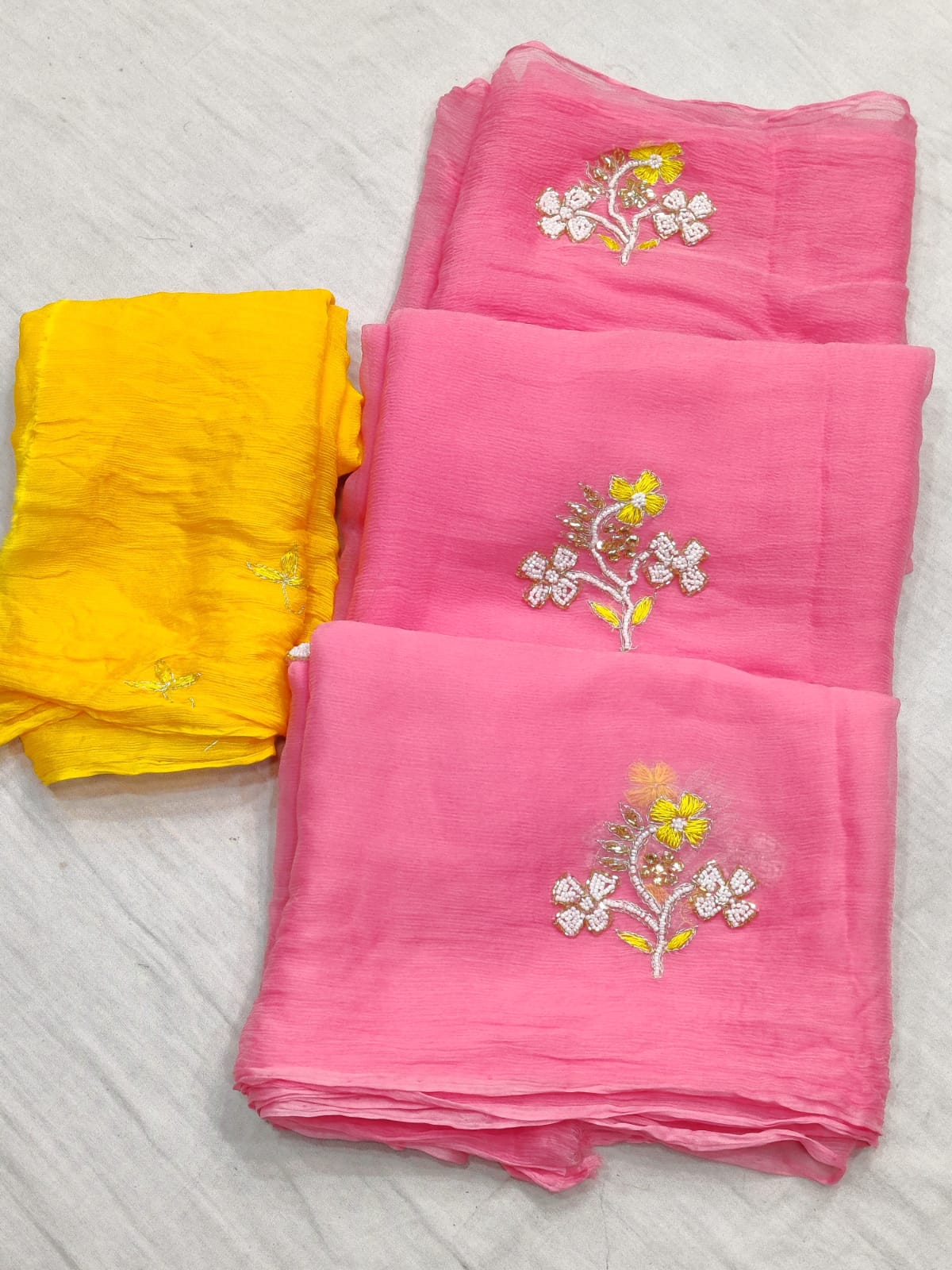 Experience the elegance and beauty of our Soma Pure Chiffon Saree, featuring handwork embroidered 13 motifs of white bead, sequins and threadwork on pure chiffon fabric. The contrast running fabric blouse adds a touch of sophistication. Admire the 13 handcrafted big butta motifs that make this saree truly unique and stunning.