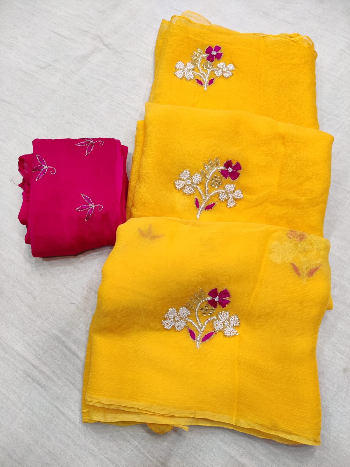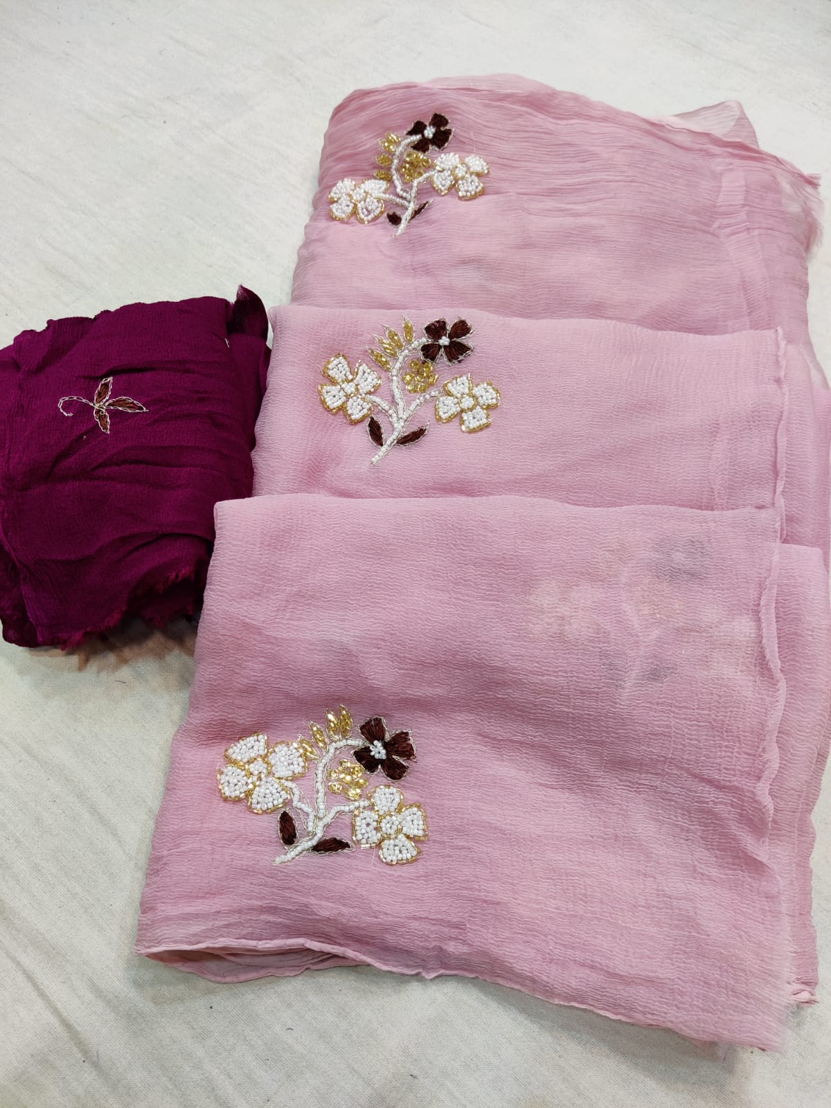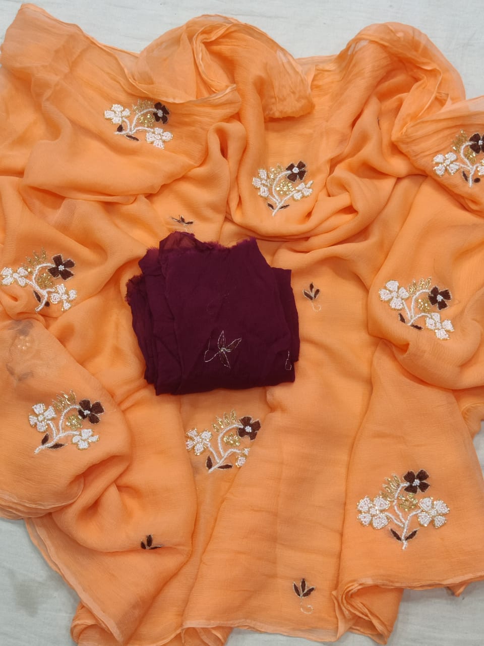 Experience the elegance and beauty of our Soma Pure Chiffon Saree, featuring handwork embroidered 13 motifs of white bead, sequins and threadwork on pure chiffon fabric. The contrast running fabric blouse adds a touch of sophistication. Admire the 13 handcrafted big butta motifs that make this saree truly unique and stunning.