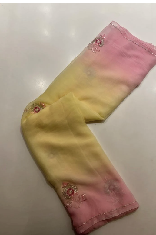 Experience a breathtaking sunset with our handcrafted chiffon saree decorated with 15 motifs. The delicate ombre beading adds a touch of elegance to this luxurious piece. Perfect for any special occasion, this saree will make you feel like a true work of art. Indulge in luxury with our exclusive handiwork.