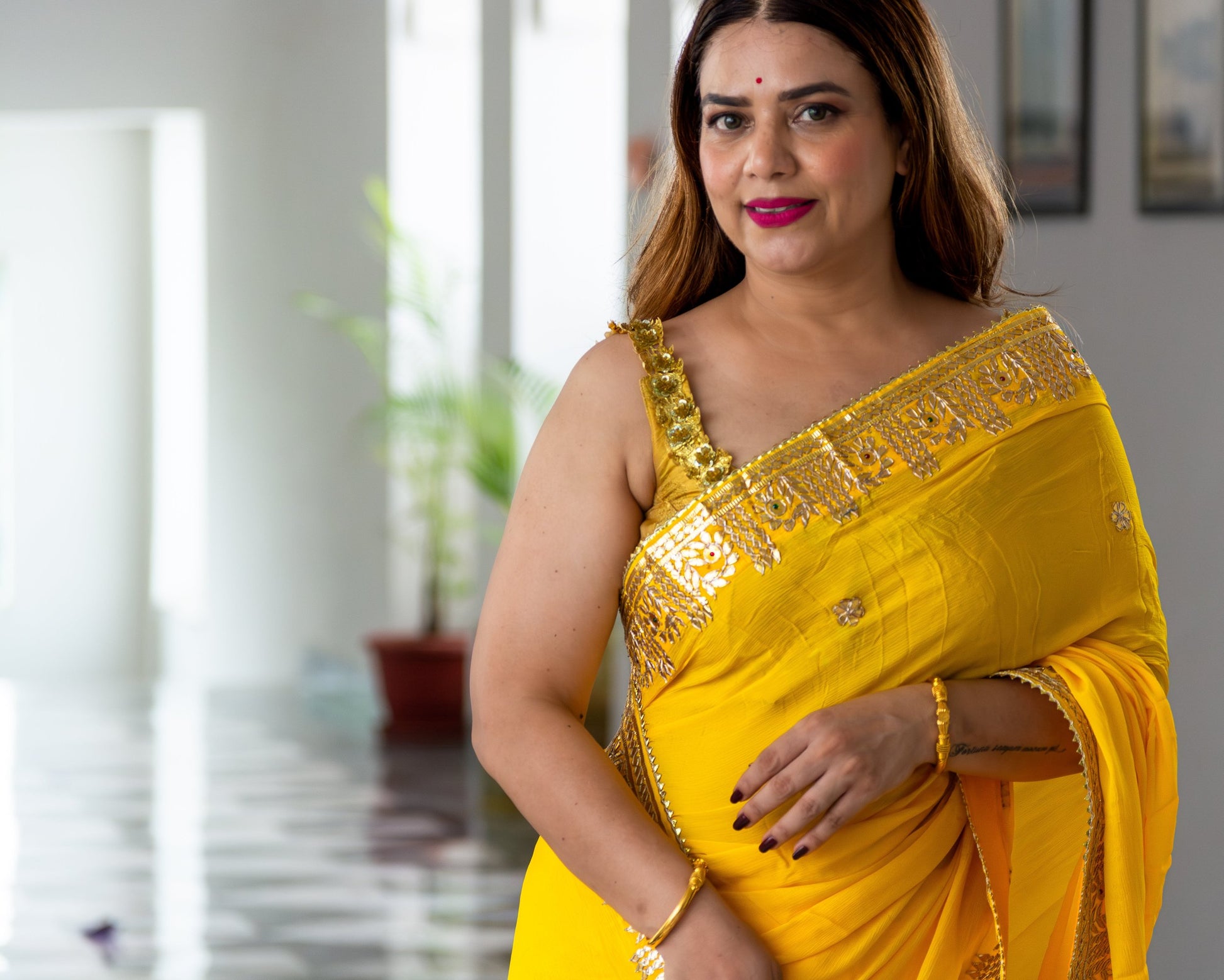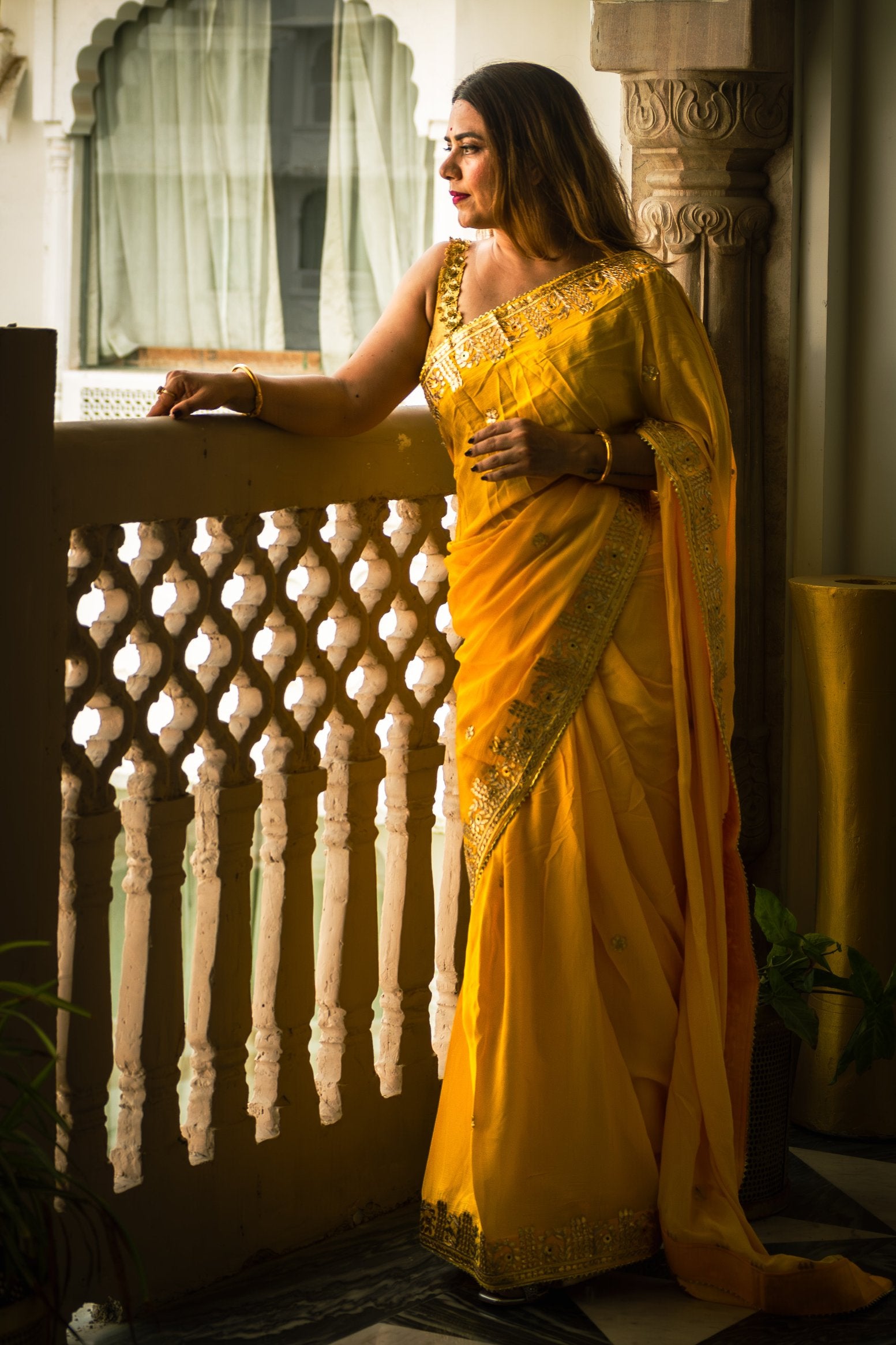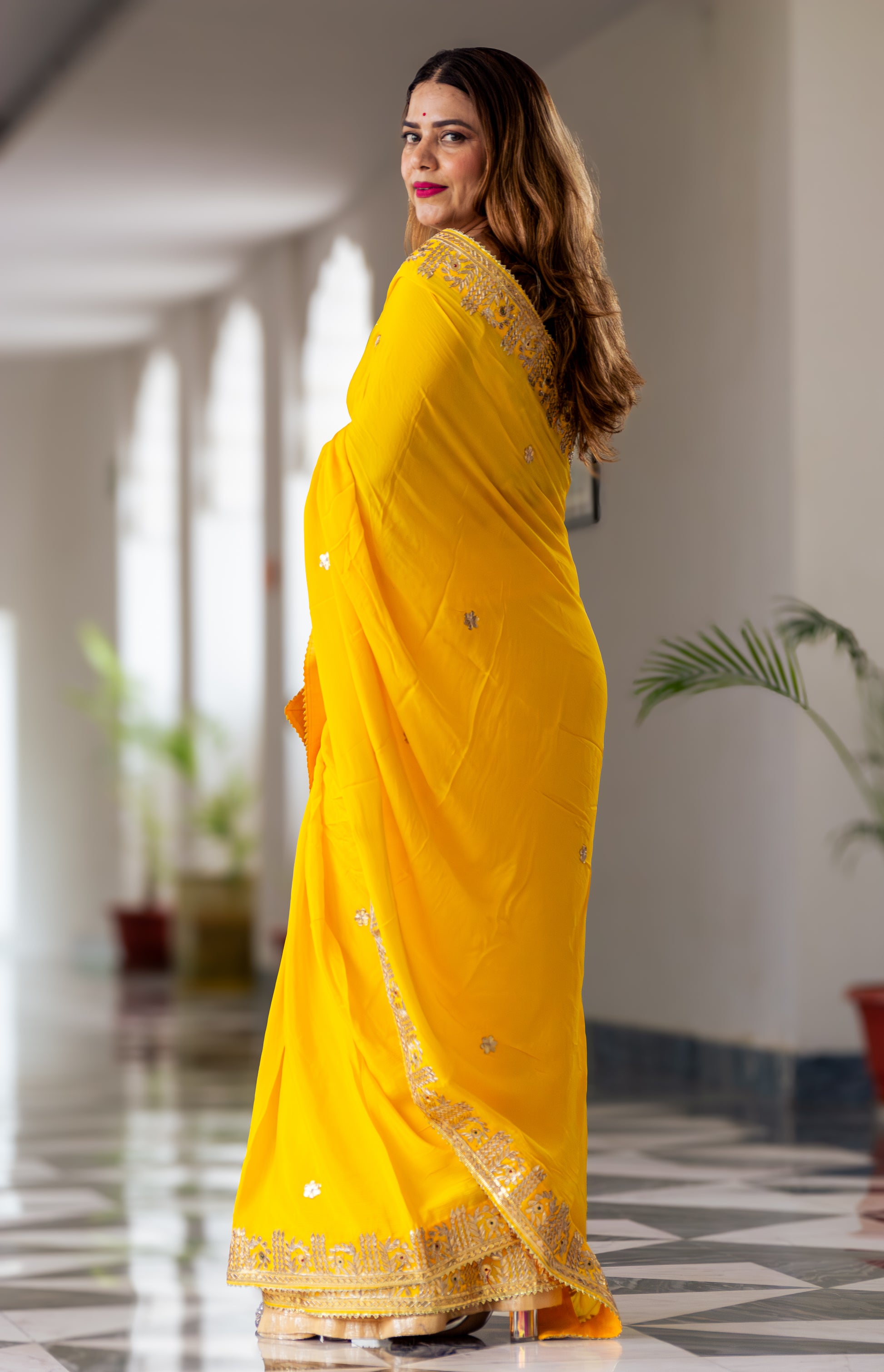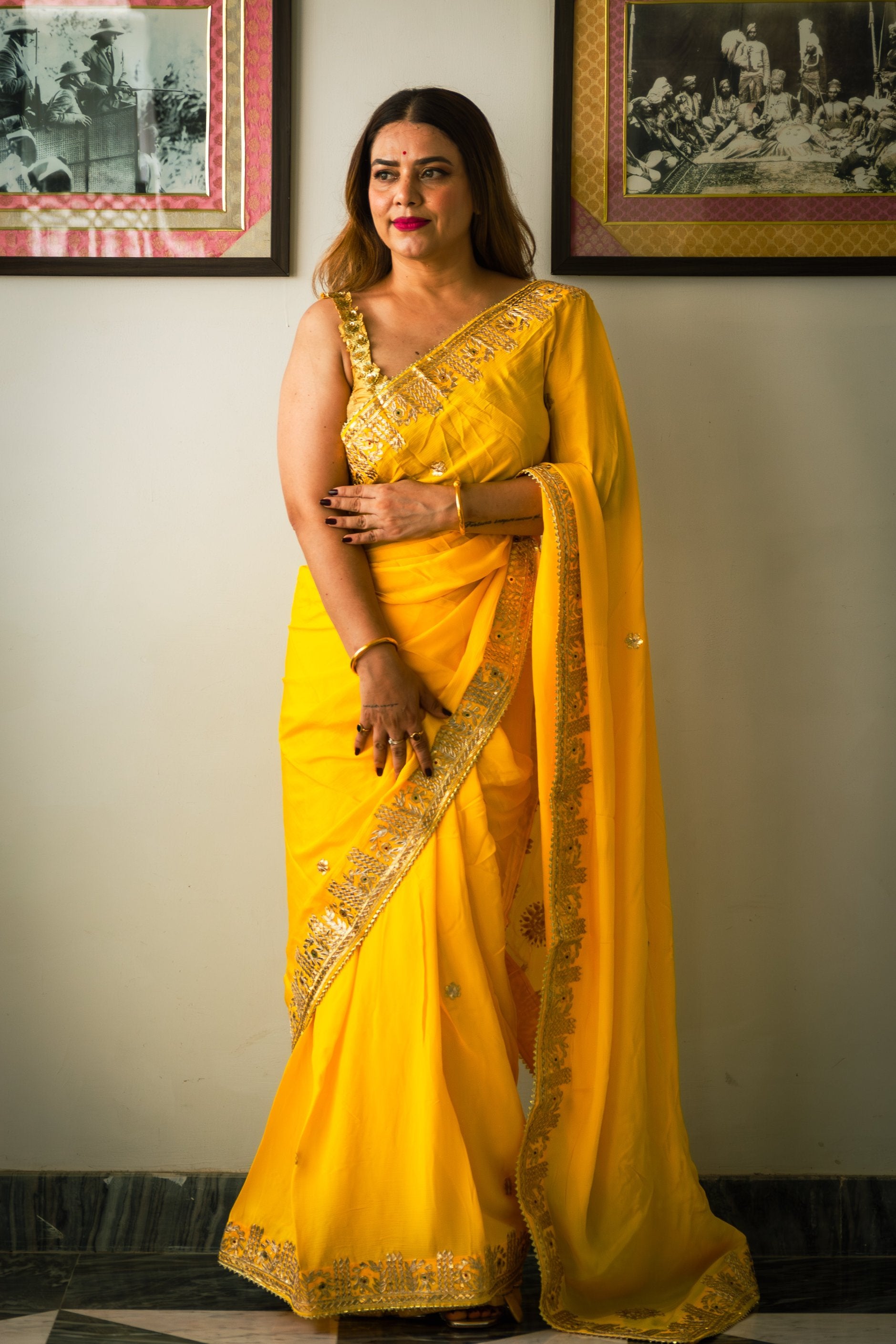 Elevate your wardrobe with the Sunshine Chinon Saree. This luxurious piece is adorned with exquisite Gotta patti handwork, adding a touch of sophistication and elegance to any occasion. The beautiful border detailing is a testament to the craftsmanship and attention to detail of this premium saree. Complete your look with this exclusive and timeless piece.