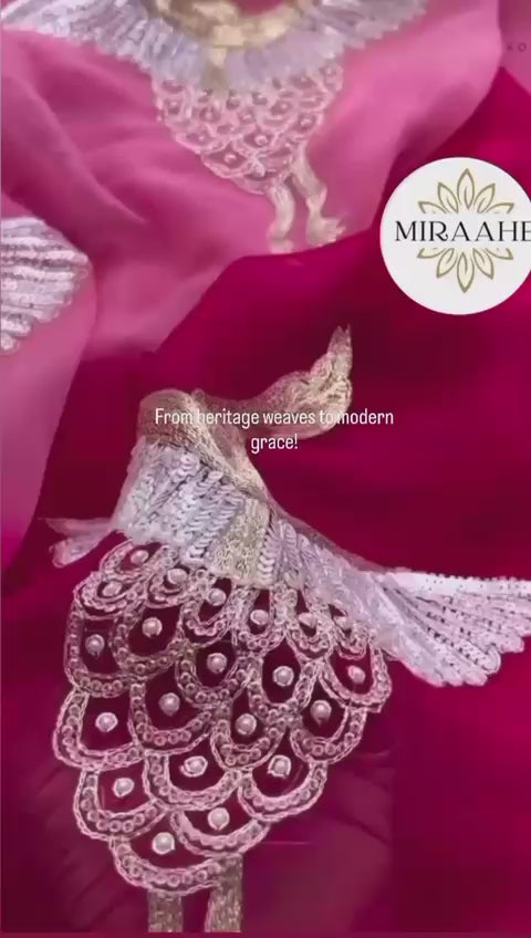 Indulge in the epitome of luxury with our Bird Thread work Sequin Pure Chiffon Saree. Handcrafted with 15 exquisite Swan bird motifs, this saree boasts of pure chiffon fabric in Ombre pink shade and intricate cutdana handwork. Elevate your style with this exclusive piece.