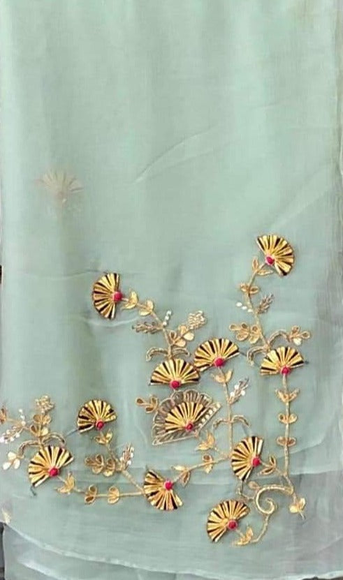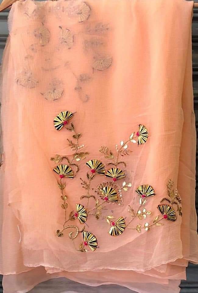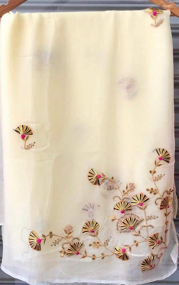 Elevate your elegance with the Vilina Gotta Patti Saree. This pure diamond chiffon saree features exquisite Gotta Patti handwork embroidery, intricate bunch design on the pallu, and small buttis design all over for a delicate and stunning look with a heavy blouse. Make a statement and stand out with this elegant piece.