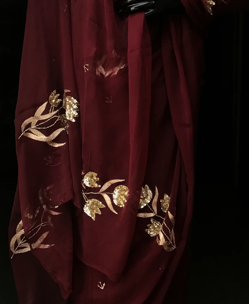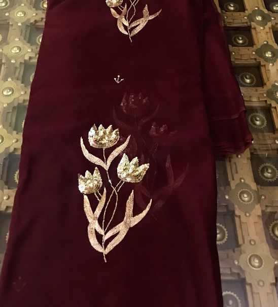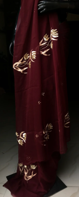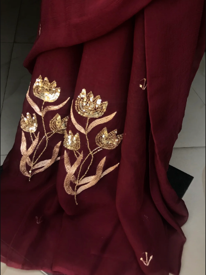 This beautiful Wine Pure Diamond Chiffon Saree is adorned with intricate sequins and aari handwork 15 butta in shades of wine. Elevate your style with this elegant and timeless piece. Perfect for special occasions, this saree is sure to make a statement.